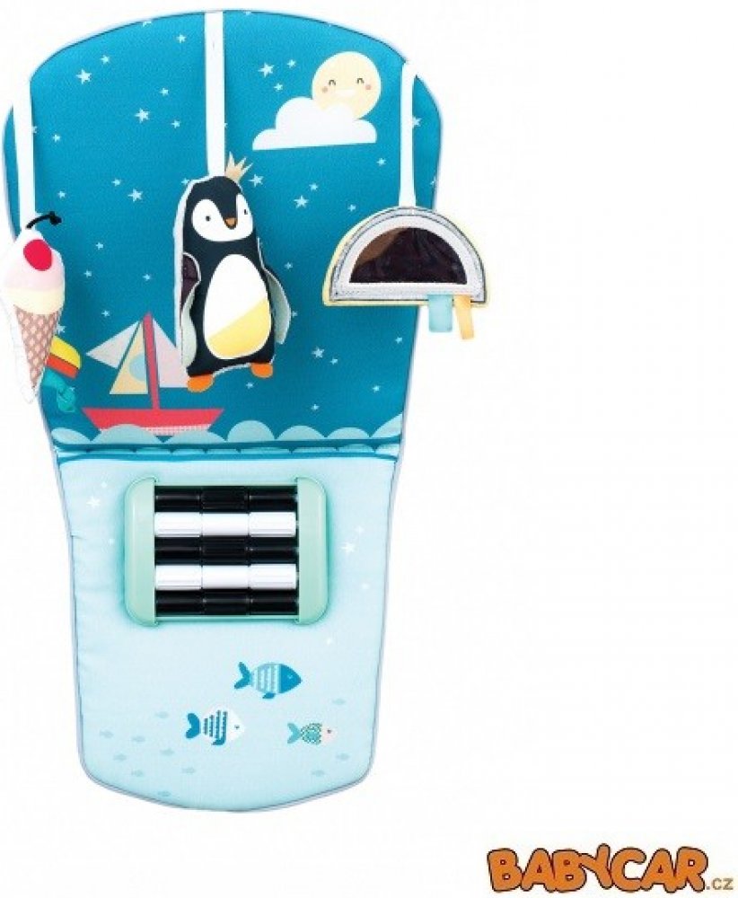 Hračka reaguje na kopání nožiček dítěte, kterými dosáhne na kontrastní černobílou podložku s pohyblivými korálky. Pozornost dítěte upoutají i zavěšené hračky a ndash; chrasticí tučňák, bezpečné zrcátko s duho...