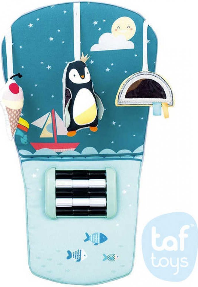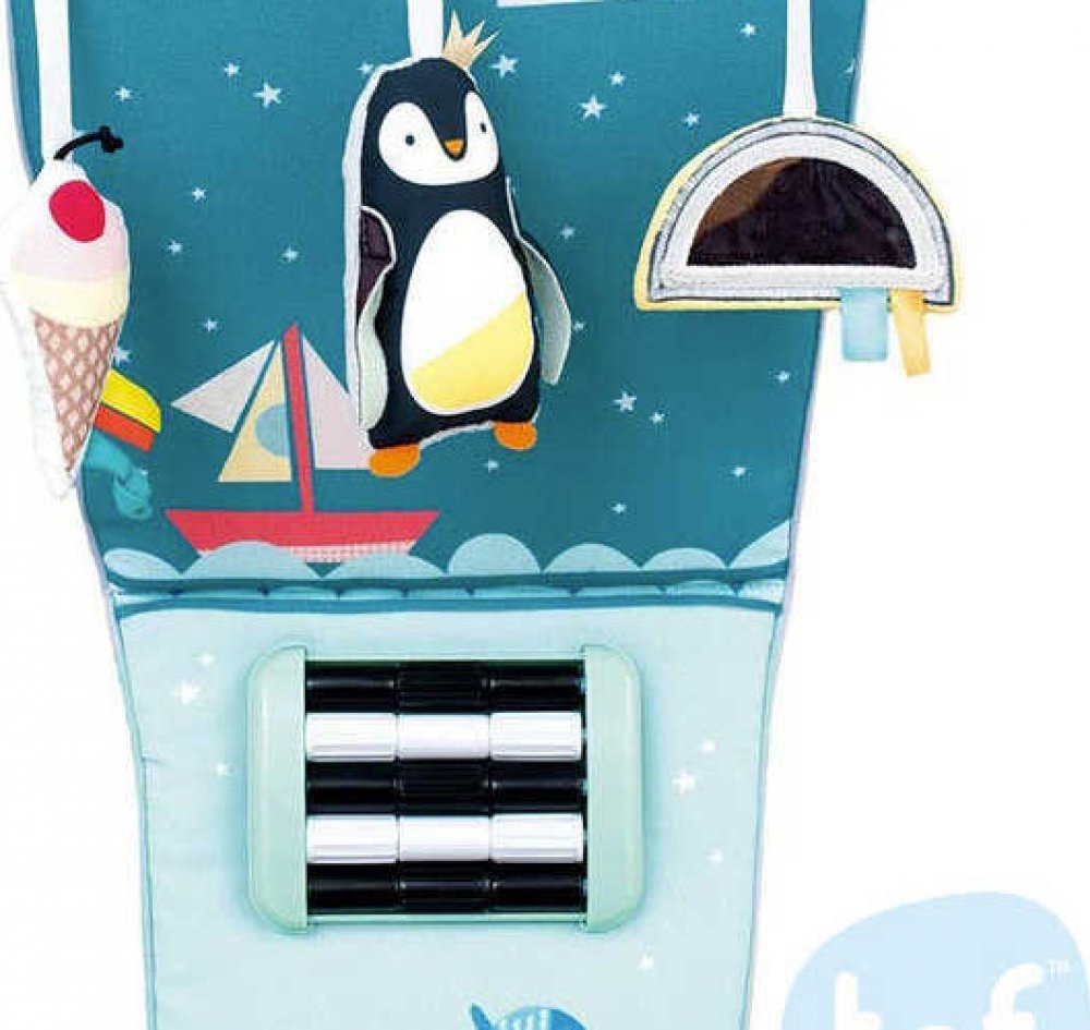 Hračka reaguje na kopání nožiček dítěte, kterými dosáhne na kontrastní černobílou podložku s pohyblivými korálky. Pozornost dítěte upoutají i zavěšené hračky a ndash; chrasticí tučňák, bezpečné zrcátko s duhou a šusticí kornout se zmrzlinou.