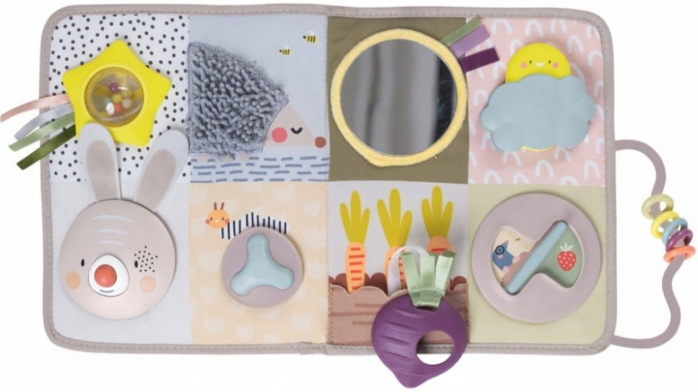 Na hracím pultu najdete králíčka s hudbou a světýlky, schovávací hry, chrasticí průhledný míček s korálky, šusticí části, kousátka, pohyblivé kroužky, otočná kolečka a další aktivity a textury ke zkoumání.