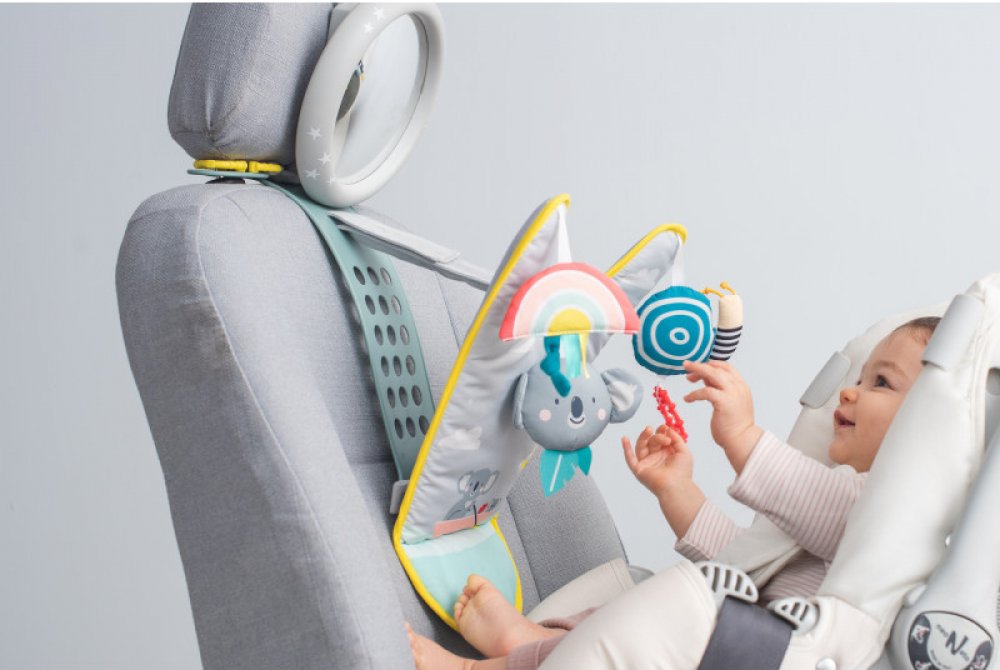 Hrací pultík se zavěšenými hračkami zabaví během jízdy dítě sedící v autosedačce proti směru jízdy. Zpětné zrcátko umožňuje rodiči dítě sledovat během jízdy.