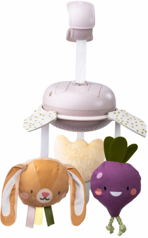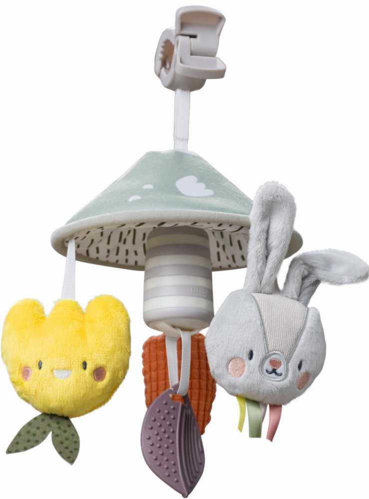 Kolotoč s roztomilými plyšovými hračkami v podobě králíčka Rylee, mrkve a tulipánu spolu s kousátkem ve tvaru listu se snadno připevní na kočárek s pomocí velkého klipu. Kolotoč při pohybu jemně cinká. Hraní se závěsnými hračkami zajistí dítěti zábavu na cestách a zároveň podporuje vývoj smyslů a motorických dovedností dítěte. Vhodné pro děti od narození.