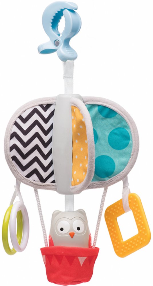 Kolotoč se snadno připevní na kočárek s pomocí velkého klipu. Jemně cinkající sova a zavěšená kousátka různých tvarů a barev zajistí dítěti zábavu na cestách.