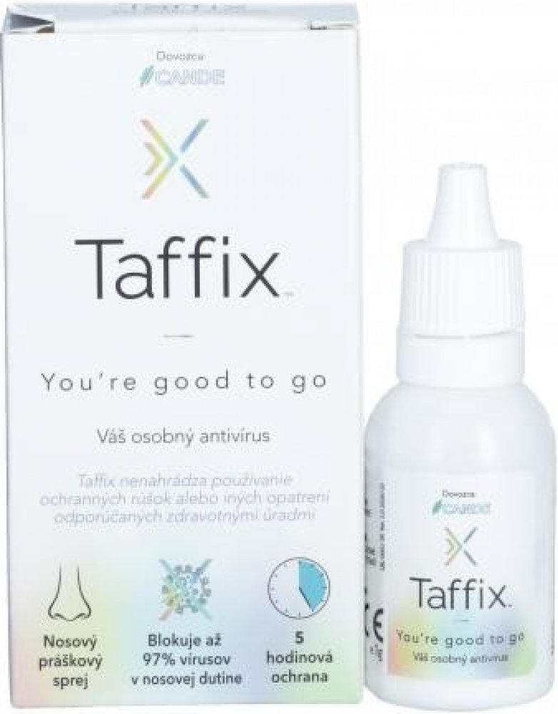 Taffix nosní sprej je zdravotnický prostředek, který se používá na blokování virů, které by mohly proniknout do dýchací soustavy a způsobit infekci v nosní dutině. Taffix je práškový nosní sprej, který se v nose změní na ochranný gel, který vytváří aktivní mechanickou bariéru v nosní dutině, která brání vniknutí virů do lidského těla. Taffix vytváří lokálně na sliznici mikroprostředí s pH 3,5, v prostředí s tím to pH nepřežije až 97% virů. Taffix funguje už za 50 vteřin od momentu vstřiku do nosní sliznice a účinkuje po dobu 5 hodin.