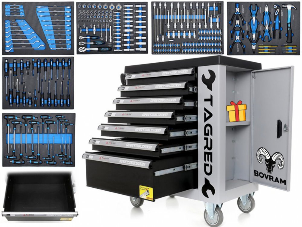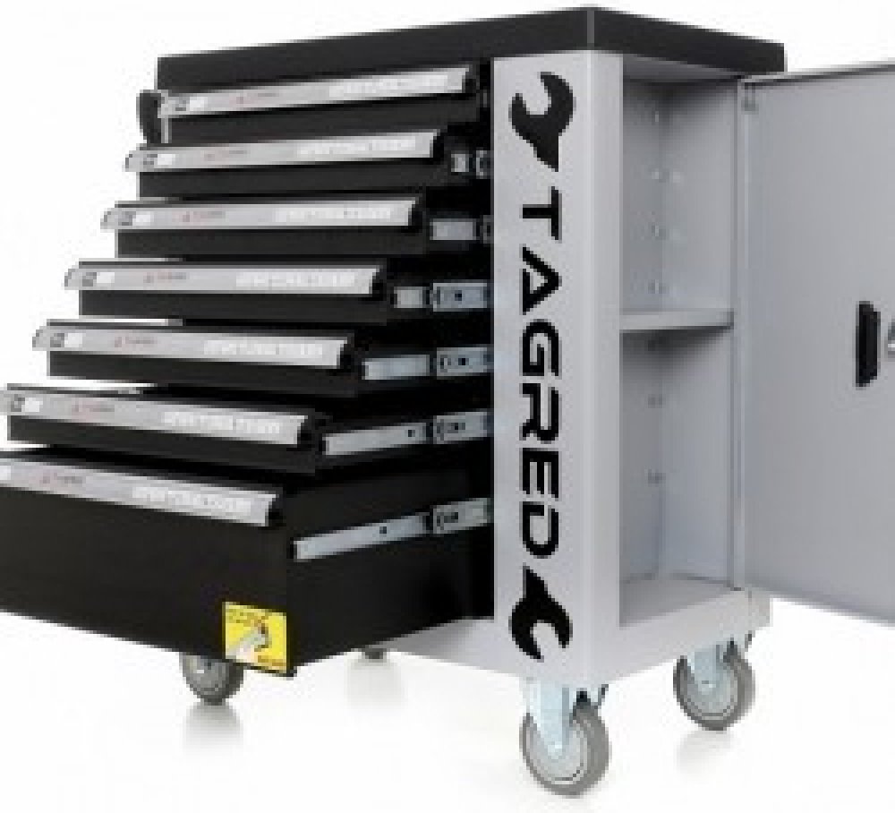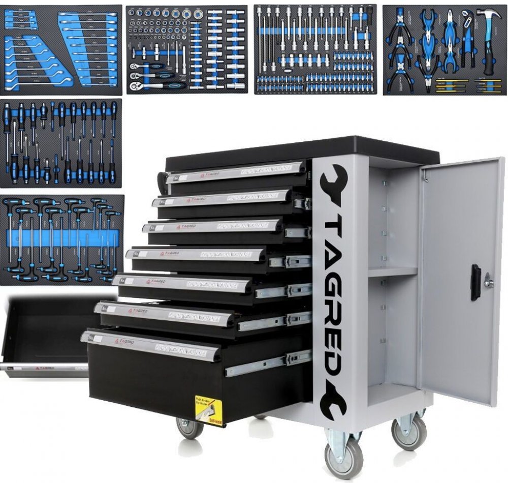 Dílenský vozík s 251 kusy nářadí Tagred TA212 Vám umožňuje udržovat pořádek na pracovišti a zároveň chrání nástroje před krádeží vozík je uzamčen pomocí klíče . Vozík má ergonomické rukojeti integrované s pracovní deskou, plně rozšiřitelné zásuvky na ložiskách. Centrální zamykání se dvěma klíči uzavírá všechny zásuvky a dvojité stěny a zásuvku zásuvky. Vozík je vybaven čtyřmi koly, což usnadňuje p...