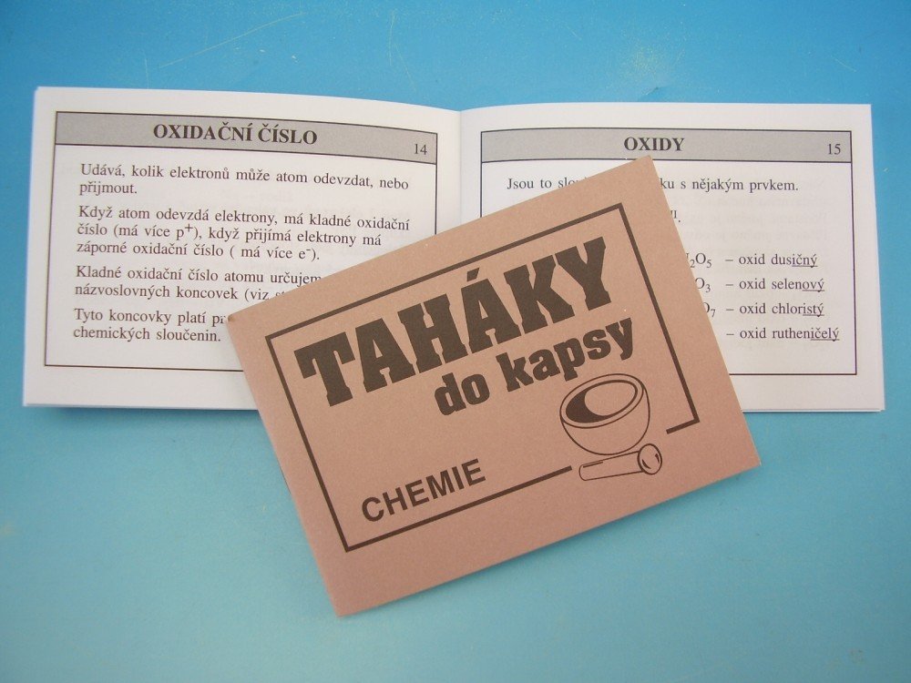 Taháky do kapsy - Chemie*zopakujete si vzorečky a chemické postupy*praktická pomůcka nejen pro školáky*ideální pro oživení dávno zapomenutých vědomostí Tahák do kapsy, který Vám připomene znalosti z chemie. Zopakujete si směsi, vzorečky a chemické postupy. Praktická pomůcka nejen pro školáky, ale i pro školou již nepovinné. Tahák je ideální pro oživení dávno zapomenutých vědomostí.