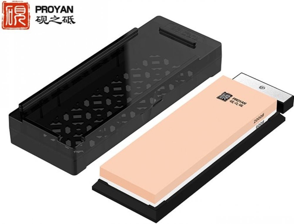 Kombinovaný brusný kámen, který obsahuje kameny se zrnitostí 800 a 2000, vyrovnávací kámen a pryžový podstavec na kámen s protiskluzovými nožičkami. Před broušením je vhodné kameny navlhčit vodou.