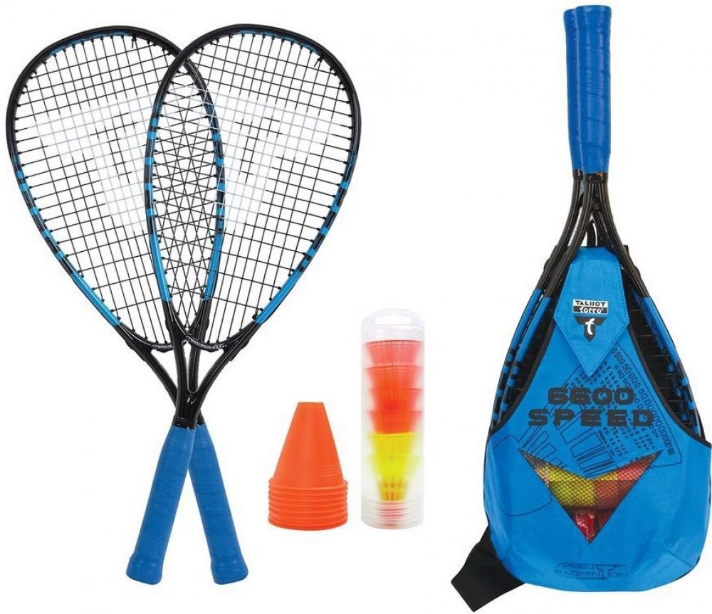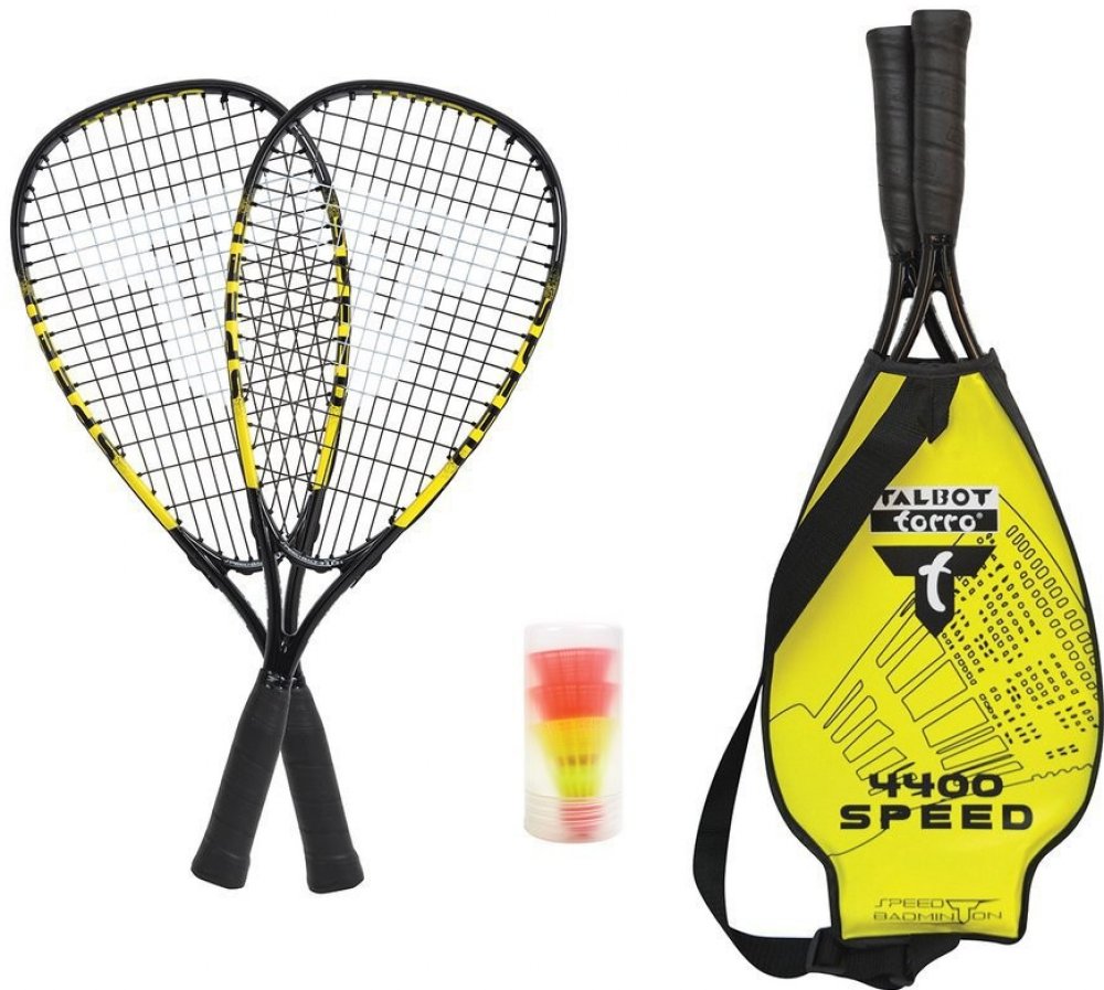 Základní speedmintonová sada Speed 4400 od Talbot-Torro. Dodáváno s 3-mi míčky (2 rychlé míčky „závodník“, 1 pomalejší „startér“) a to rovnou v užitečné přenosné tašce se síťovinou. Šikovné rakety (délka 54,5 cm, váha 165 g, profil rámu 17,3 mm) jsou o 4 cm kratší než běžná rychlostní badmintonová raketa a tím pádem jsou výrazně ovladatelnější. Perfektní tedy zejména pro začátečníky, rekreační hráče a děti.