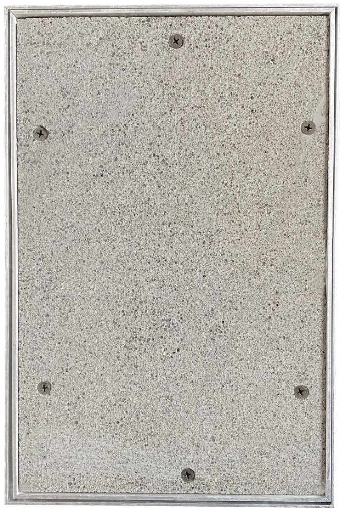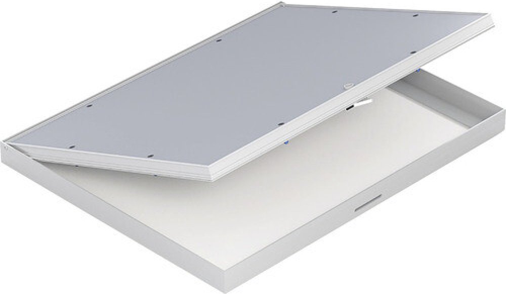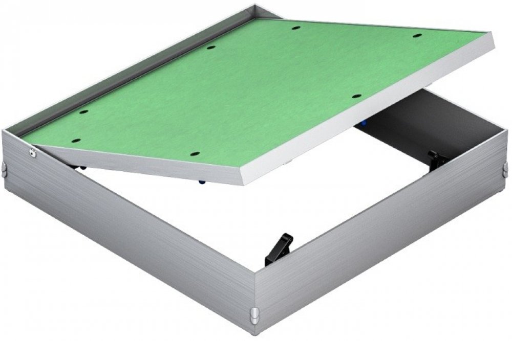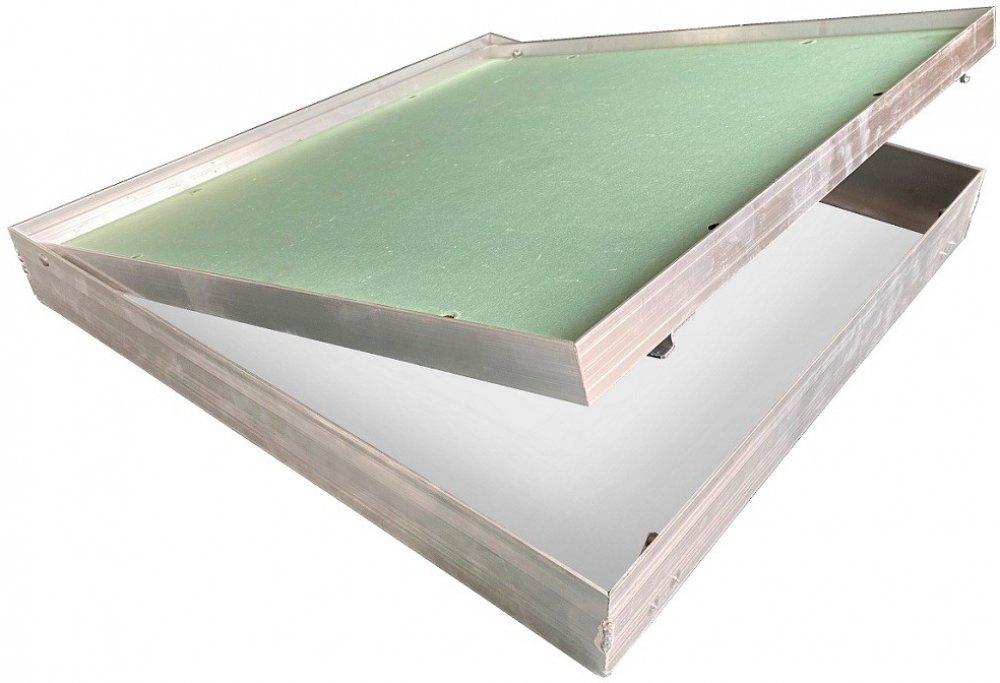 Zpracování: Hlavní nosná konstrukce dvířek a rám jsou vyrobeny z hliníkového profilu osazené impregnovanou sádrokartonovou deskou GKBi o síle 12,5 mm. Možnost použít dvířka jako pravé i levé. Mezi pohyblivým rámem klapky a pevným rámem je viditelná mezera cca 1,5 mm. Pohodlné otevírání a zavírání je zajištěno tlačnými US zámky, které jsou umístěné na venkovním rámu. Zatlačení na desku vnitřního rámu v místě zámku způsobí vycvaknutí či zacvaknutí západky.