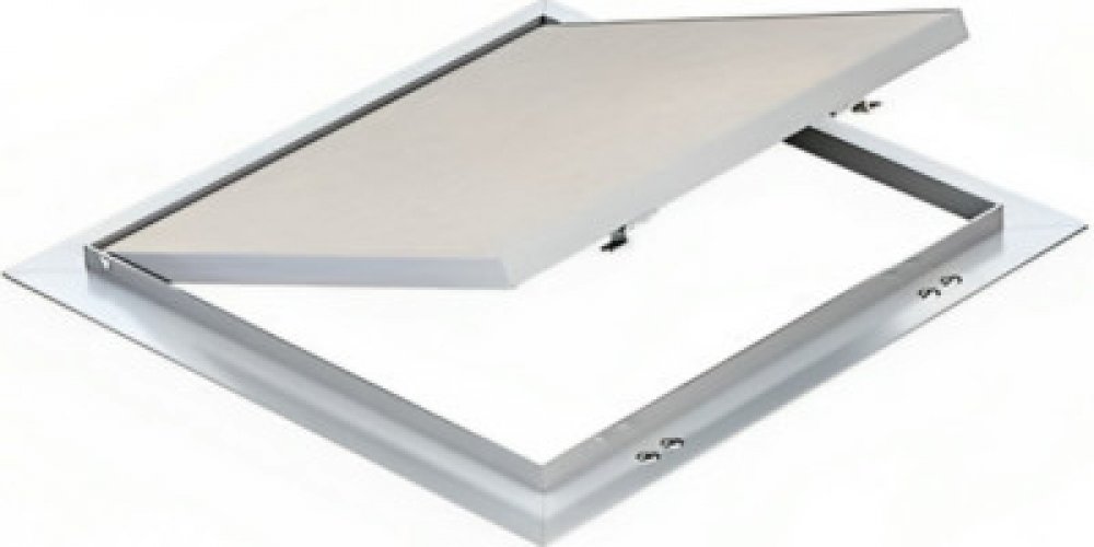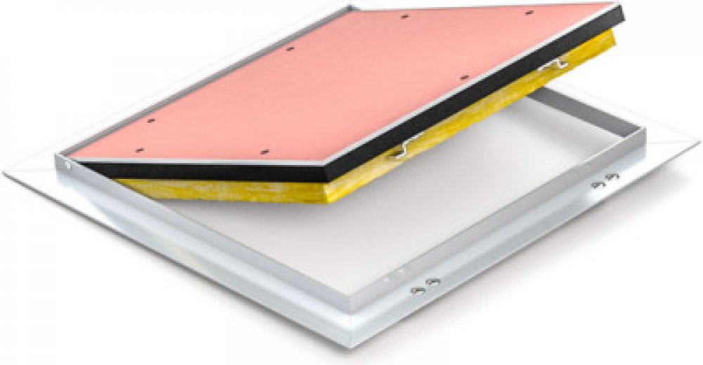 Zpracování: Hlavní nosná konstrukce dvířek a rám jsou vyrobeny z hliníkového profilu osazené impregnovanou sádrokartonovou deskou GKBi o síle 12,5 mm. Možnost použít dvířka jako pravé i levé. Mezi pohyblivým rámem klapky a pevným rámem je viditelná mezera cca 1,5 mm. Pohodlné otevírání a zavírání je zajištěno tlačnými US zámky, které jsou umístěné na venkovním rámu. Zatlačení na desku vnitřního rámu v místě zámku způsobí vycvaknutí či zacvaknutí západky.