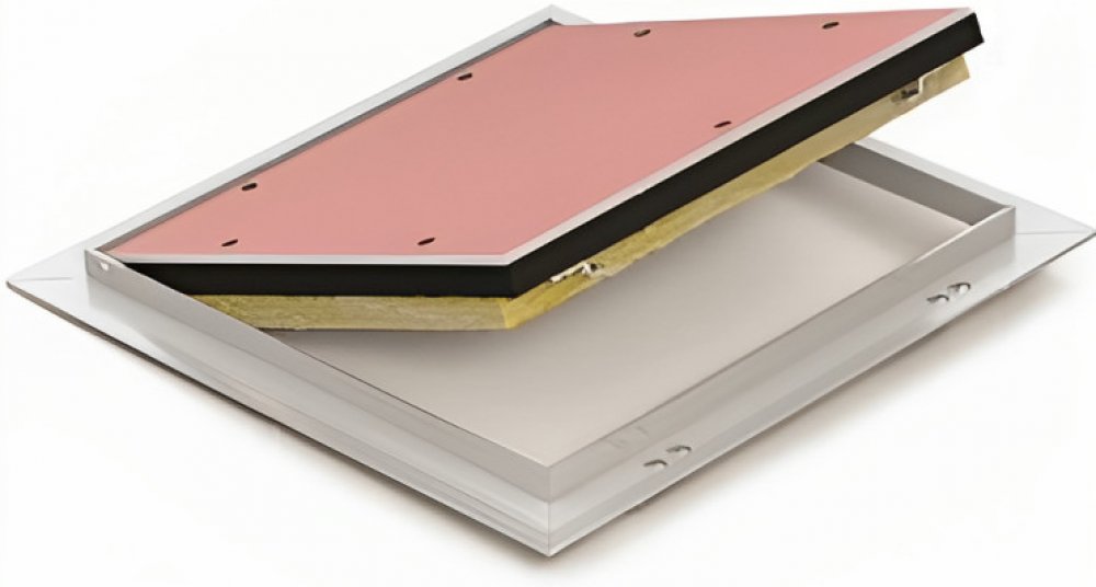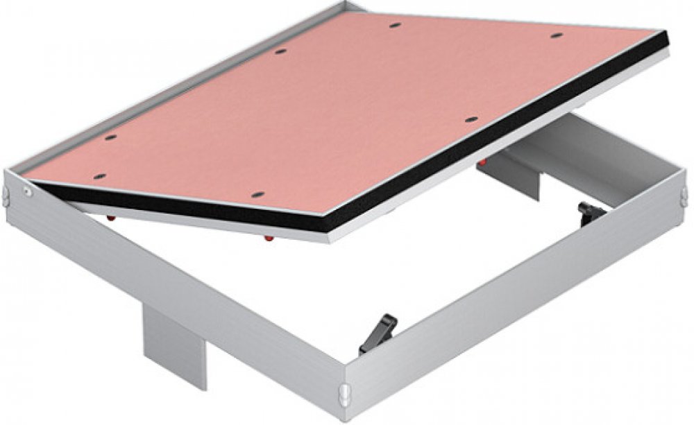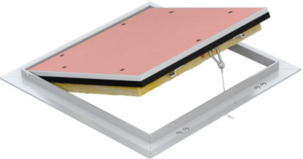 Zpracování: Hlavní nosná konstrukce dvířek a rám jsou vyrobeny z hliníkového profilu osazené impregnovanou sádrokartonovou deskou GKBi o síle 12,5 mm. Možnost použít dvířka jako pravé i levé. Mezi pohyblivým rámem klapky a pevným rámem je viditelná mezera cca 1,5 mm. Pohodlné otevírání a zavírání je zajištěno tlačnými US zámky, které jsou umístěné na venkovním rámu. Zatlačení na desku vnitřního rámu v místě zámku způsobí vycvaknutí či zacvaknutí západky.