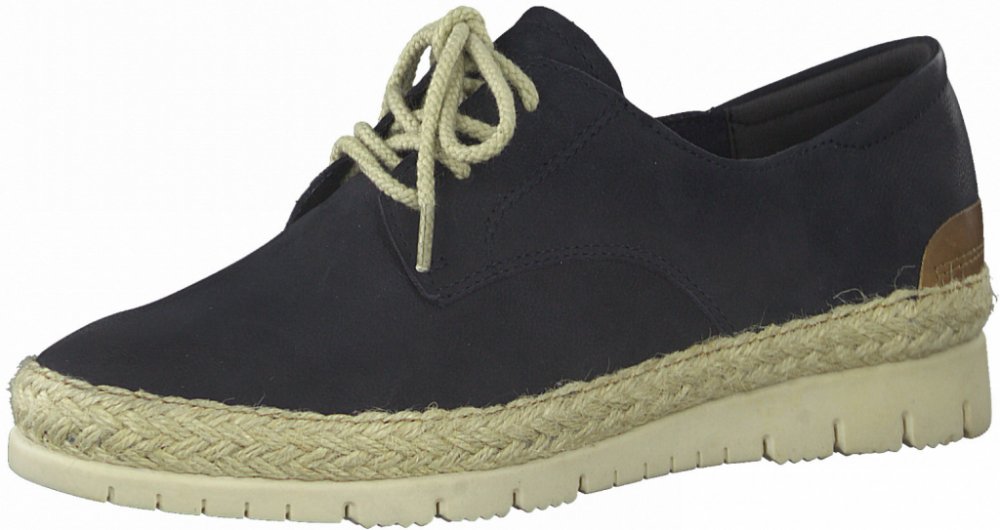 Dámská obuv Tamaris má svršek v temně modrém odstínu Navy. Je kožený a tkaničky spolu s proplétaným páskem u podešve jim dodávají přírodní vzhled. Lehce vyšší podešev je však přesto flexibilní.