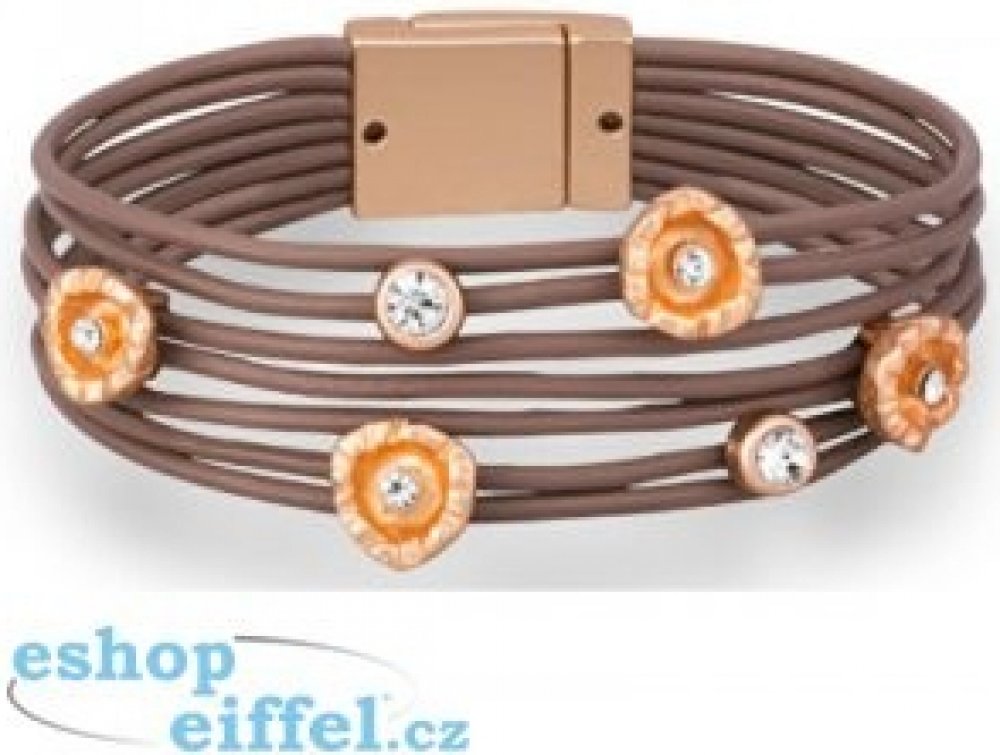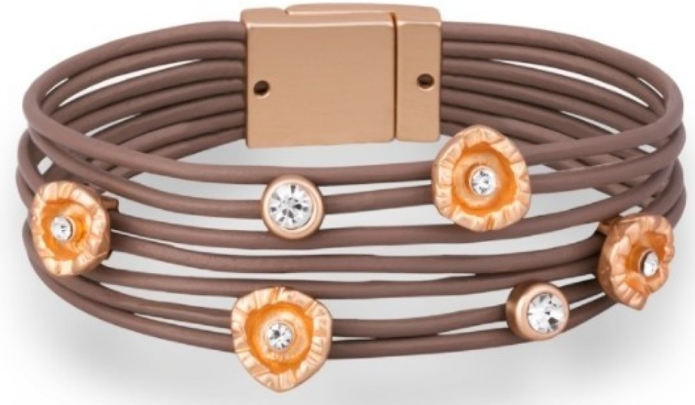 Náramek Tamaris Flora trendy módní doplněk k Vašemu outfitu. Náramek je v kombinované hnědé imitace kůže s kovovými komponenty jako doplňky. Materiál: bižuterie Povrchová úprava: gold PVD Barva: crystal Průměr: 24mm/ délka 18cm. Zapínání: magnet