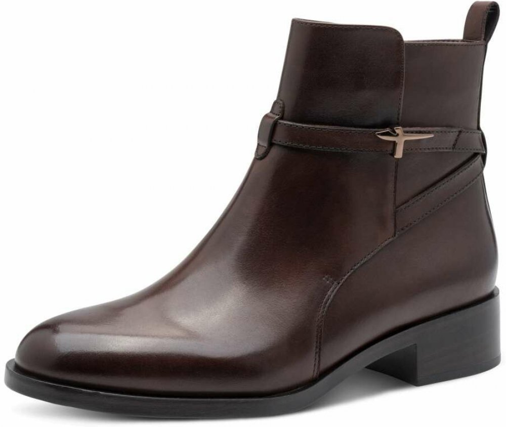 Kotníčková obuv TAMARIS z hladké kůže v mahagonově hnědé barvě lehce zdobená zlatým logem značky. Zapínání obuvi je na zip na vnitřní straně. Uvnitř příjemná vyměkčená textilní podšívka a pohodlná vyměkčená stélka s paměťovou pěnou "Touch it" pro pohodlné nošení. Patentovaná technologie ANTISLIDE nabízí pevný postoj díky protiskluzovému podpatkovému plátku – i na vysokých podpatcích. Profilovaný podpatkový plátek zaručuje lepší přilnavost k podkladu a snižuje tak nebezpečí uklouznutí i na strmých sklonech.