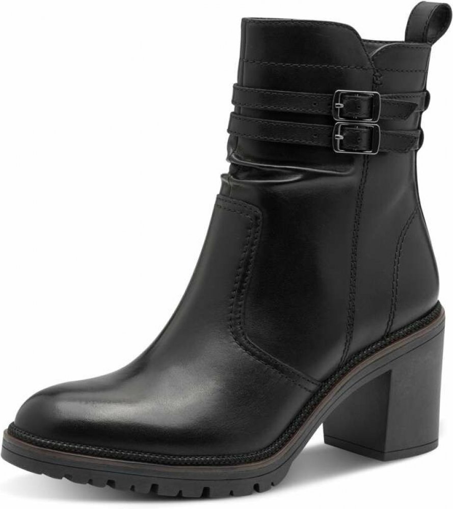 Tyto dámské kotníkové boty značky Tamaris představují dokonalou kombinaci nadčasového designu a moderního komfortu. Kožený svršek černé barvy působí univerzálně, takže jej snadno zkombinujete s různými outfity. Zvláštní kouzlo botám dodává atraktivní aplikace kolem kotníku, která přitahuje pozornost a podtrhuje jejich stylový vzhled. Obouvání je díky bočnímu zipu snadné a rychlé – během okamžiku tak vklouznete přímo do pohodlí. Uvnitř na vás čeká měkká stélka a příjemná textilní podšívka, které se postarají o váš komfort i při delším nošení. Vyšší podpatek dodává postavě ladný vzhled, přitom je vybaven protiskluzovou úpravou, která zajišťuje stabilitu a bezpečnost při chůzi. Díky tomu získáte sebevědomí a zároveň pohodlí, které oceníte každý den. Tyto působivé kotníkové boty doladí elegantnější outfit i ležérní kombinace, a stanou se tak vaším spolehlivým doplňkem pro celou sezónu.