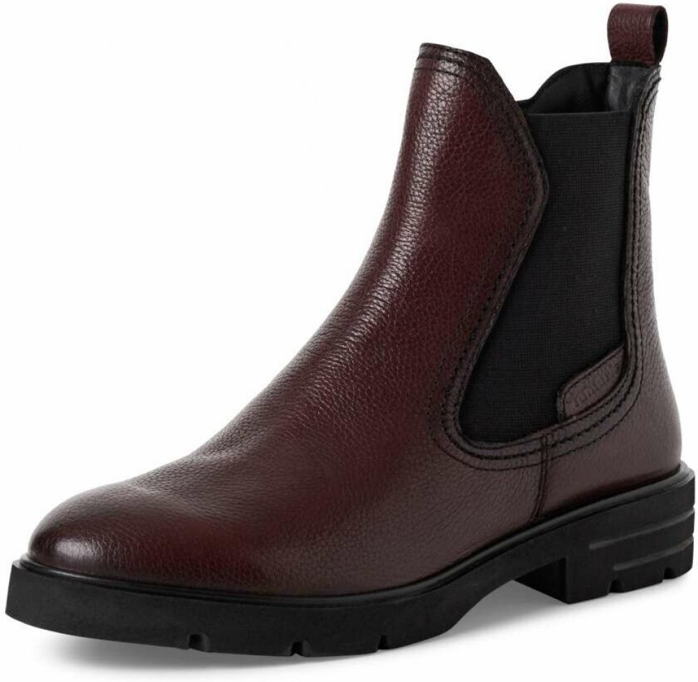 Kotníčková obuv TAMARIS v kombinaci dezénové hladké kůže a textilního materiálu ve vínové barvě. Zapínání obuvi je na zip na vnitřní straně. Na vnější straně je všita široká pružná vsadka usnadňující prozutí obuvi a pohodlné nošení. Uvnitř je zateplená příjemná fleecová podšívka a pohodlná vyměkčená stélka s paměťovou pěnou "Touch it" pro pohodlné nošení.