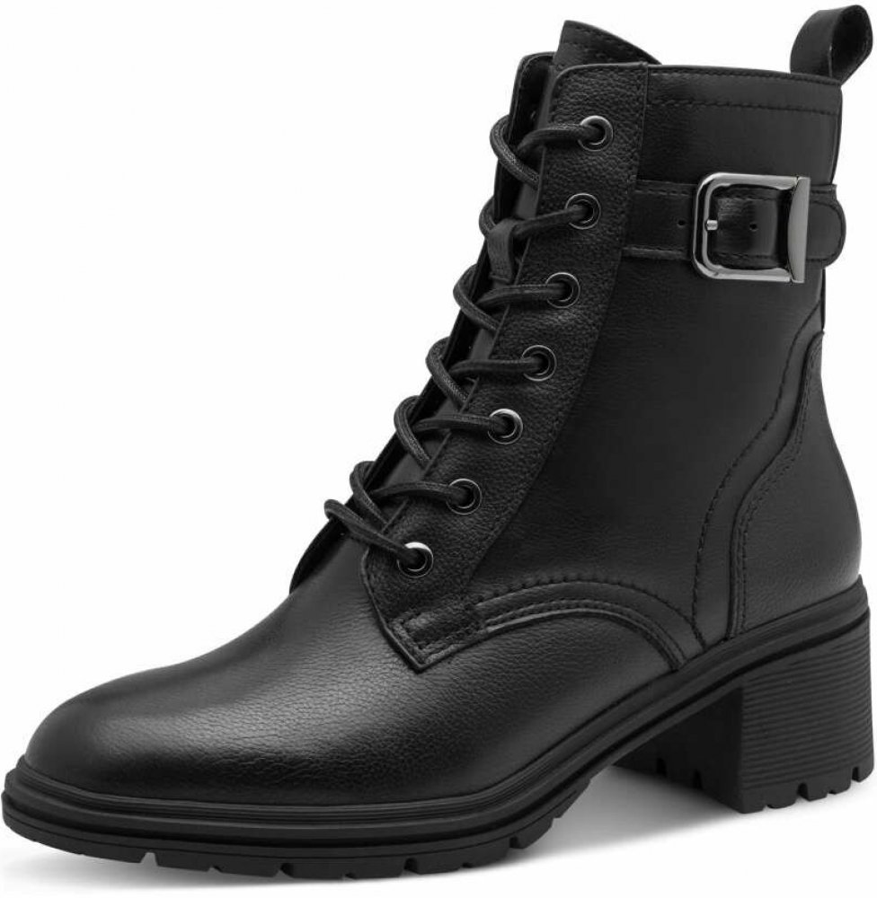 Kotníčková obuv TAMARIS v kombinaci hladké kůže a syntetické kůže v černé barvě. Zapínání obuvi je na zip na vnitřní straně, předním šněrováním je možné obuv přizpůsobit objemu nártu. Uvnitř je lehce zateplená příjemná fleecová podšívka a pohodlná vyměkčená stélka s paměťovou pěnou "Touch it" pro pohodlné nošení.