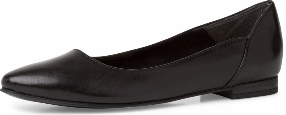 Dámské balerinky značky Tamaris. Klasický kožený hladký svršek střižený do mírné špice a zajímavé vnější straně paty. Ta vypadá na noze velice zajímavě a originálně. Stélka je kožená a vyměkčená. Nízký podpateček předurčuje tento model pro pohodlné vícestranné využití - běžné denní nošení, tak pro společenské účely.