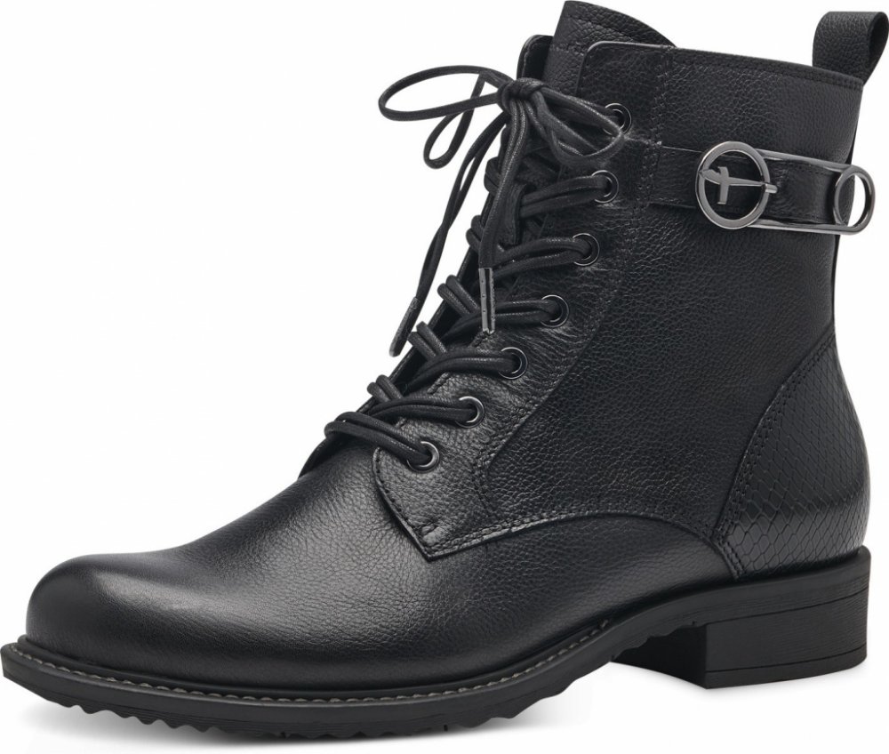 Dámské šněrovací kotníkové boty Tamaris na bytelné podrážce s lehkým zateplením a bočním zipem pro snadnější přezouvání. Podešev:Podešev obuvi je s protiskluzovým vzorkem vyrobená ze syntetického materiálu. Na platformě pro lepší izolaci. Klínek vysoký 3,5 cm. Svršek:Svršek obuvi je vyrobený z koženého a syntetického materiálu. Barva svršku je černá. Podšívka:Podšívka je zateplená, vyrobená z textilního a koženého materiálu. Stélka: Stélka je vyrobená z textilního materiálu. Šířka:G Svršek: kůže/syntetika Podšívka: textil/kůže Stélka: textil Podešev: syntetika Šířka: g