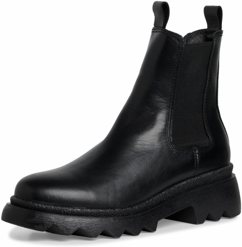 Dámské kotníkové boty Tamaris na bytelné podrážce s protiskluzovým vzorem. Díky jednoduchému střihu jsou snadno sladitelné s vaším outfitem. Teplá stélka udrží vaše nohy v teple. Gumy po straně slouží pro snadné prozutí. Podešev:Podešev obuvi je s protiskluzovým vzorkem vyrobená ze syntetického materiálu. Platforma pro lepší izolaci. Podpatek vysoký 5 cm. Svršek:Svršek obuvi je vyrobený z koženého materiálu. Barva svršku je černá. Podšívka:Podšívka je zateplená, vyrobená z textilního materiálu. Stélka:Stélka je vyrobená z textilního materiálu. Šířka:G Svršek: kůže Podšívka: textil Stélka: textil Podešev: syntetika Šířka: g