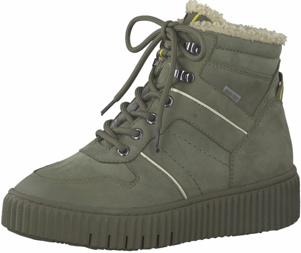 Dámské zateplené kotníkové boty Tamaris na bytelné podrážce. Díky zapínání na zip po straně jsou snadno prozutelné. Hodí se pro každodenní nošení v zimních dnech. Podešev:Podešev obuvi je s protiskluzovým vzorkem vyrobená ze syntetického materiálu. Je flexibilní díky ručnímu prošívání. Na platformě vysoké 3,5 cm. Svršek:Svršek obuvi je vyrobený z koženého a syntetického materiálu s membránou Duotex. Barva svršku je zelená. Podšívka:Podšívka je zateplená, vyrobená z textilního a syntetického materiálu. Stélka: Stélka je vyrobená z textilního materiálu s vyměkčením. Šířka:G Svršek: kůže/syntetika Podšívka: textil/syntetika Stélka: textil Podešev: syntetika Šířka: g