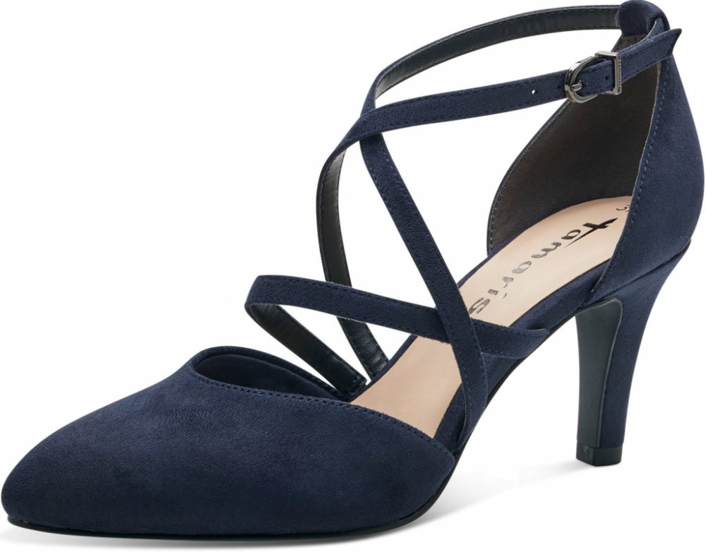 Elegantní dámské společenské lodičky Tamaris s překříženými pásky kolem nártu. Jsou snadno sladitelné s Vaším outfitem, díky jednoduchosti, kterou boty nabízejí. Podešev:Podešev obuvi je s jemným protiskluzovým vzorkem vyrobená ze syntetického materiálu. Podpatek vysoký 7,5 cm. Svršek:Svršek obuvi je vyrobený z textilního materiálu. Barva svršku je modrá. Podšívka:Podšívka je vyrobená ze syntetického a textilního materiálu. Stélka:Stélka je vyrobená ze syntetického a textilního materiálu s vyměkčením Touch it. Šířka:G Svršek: textil Podšívka: syntetika/ textil Stélka: syntetika/ textil Podešev: syntetika Šířka: G