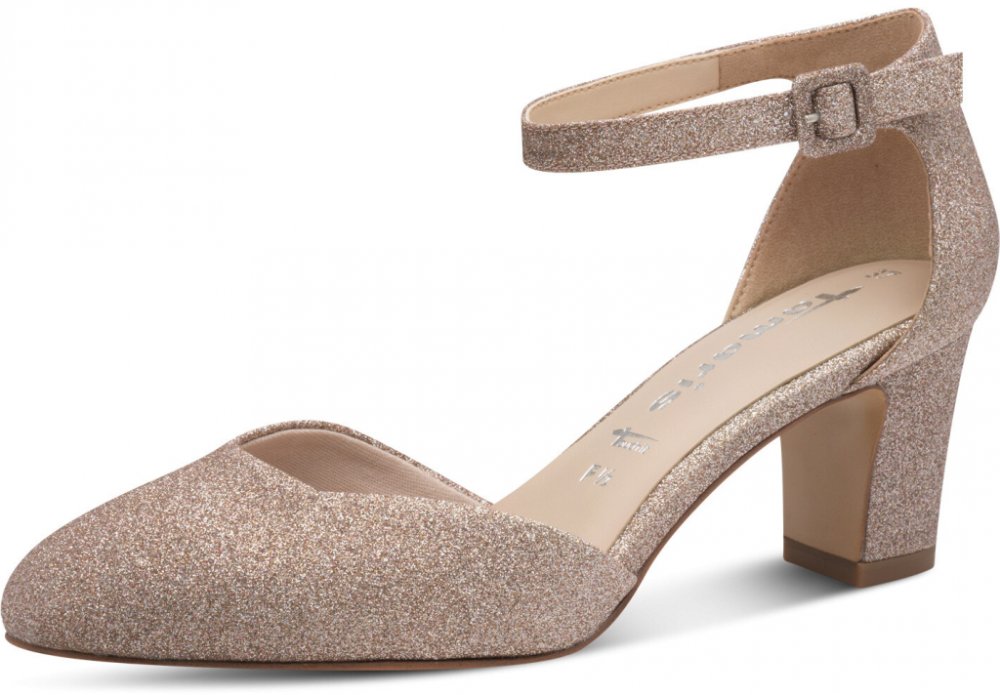 Lodičky TAMARIS ze syntetického materiálu ve starorůžové třpytivé barvě vhodné pro běžný den i slavnostnější chvíle. Zapínání obuvi je na délkově upravovatelný pásek kolem kotníku se skrytou pružnou vsadkou a potaženou přezkou. Uvnitř obuvi je textilní podšívka a vyměkčená stélka "Touch it" pro pohodlné nošení. Patentovaná technologie ANTISLIDE nabízí pevný postoj díky protiskluzovému podpatkovému plátku – i na vysokých podpatcích. Profilovaný podpatkový plátek zaručuje lepší přilnavost k podkladu a snižuje tak nebezpečí uklouznutí i na strmých sklonech.