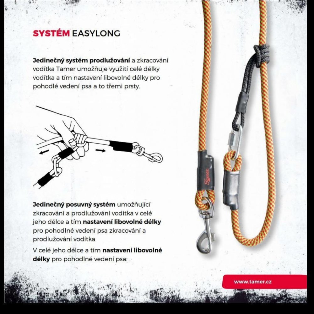 Vodítko Tamer s patentovaným systémem umožní zvolit si jednoduchým pohybem jeho délku. Všechna vodítka jsou vyráběna z bezpečných materiálů.