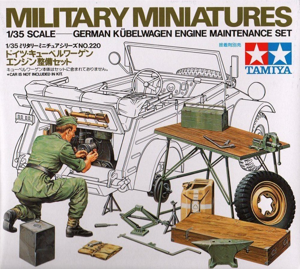 1:35 Motor německého vozidla Kübelwagen a dílenské vybavení Tamiya. Plastikové modely, Doplňky. Set nářadí a dílenského vybavení, díky kterému lze vytvořit scénu právě probíhající opravy na legendárním německém vozidle Kübelwagen.
