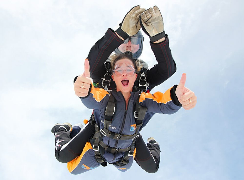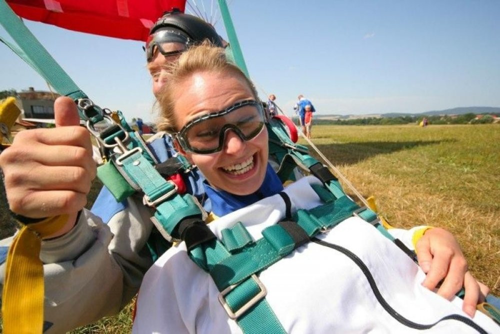 Tandemový seskok je jedinečná příležitost vyskočit si z letadla a zažít paráááádní euforii z volného pádu. Nejdříve proběhne krátká instruktáž, co při skoku dělat a co raději nedělat. Třeba se nedržet zuby nehty letadla. Pak přijde na řadu oblíkačka do výstroje a nástup do letadla. Veškeré obavy zmizí hned, když se dozvíte, že jeden instruktor zvládne klidně 387 seskoků za měsíc. A všechny bezpečně. Pak není žádný problém nastoupit do letadla a užít si vyhlídkový let vzhůru. Ve výšce 3 000 až 4 000 metrů se vyskočí a nastává očekávaný volný pád, který trvá zhruba jednu minutu v rychlosti až 200 km/h. Prostě paráda! Let s padákem zabere 10 až 15 minut a kochání krajinou je nezapomenutelné. Po dohodě s instruktorem lze vyzkoušet ovládání padáku a vzít let do vlastních rukou. Celý zážitek trvá přibližně 3 hodiny. Adrenalin koluje v žilách a po přistání je touha zkusit to znovu stále silnější.