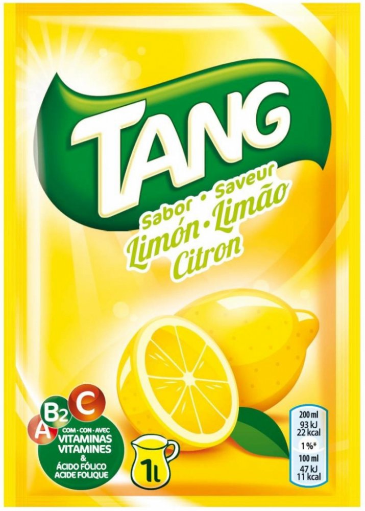 Cukr, kyselina: kyselina citronová, aroma: obsahuje sóju, sladidla: aspartam, acesulfam K, protispékavá látka: fosforečnany vápenaté, vitamín C, jedlá sůl, modifikovaný škrob, vitamín A, kyselina listová, vitamín B2, barvivo: kurkumin.