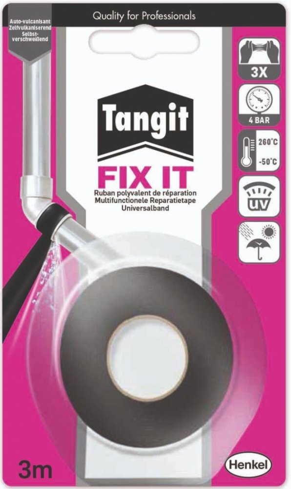 Těsnící páska Fix it od značky Tangit slouží pro opravy a dočasné utěsnění trubek, kohoutů, hadic a potrubí. Páska s délkou 3 m odolává tlaku do 4 barů, teplotám od -50 °C do +260 °C a UV záření. Páska dosahuje maximální pevnosti až po 24 hodinách a lze jednoduše odstranit beze zbytků. Pro správnou aplikaci upevněte palcem konec pásky k opravovanému předmětu a pod silným tahem navíjejte. Dle typu aplikace naneste několik vrstev. Pásku odstřihněte a volný konec zafixujte.
