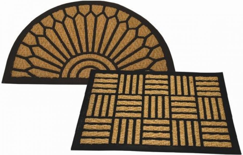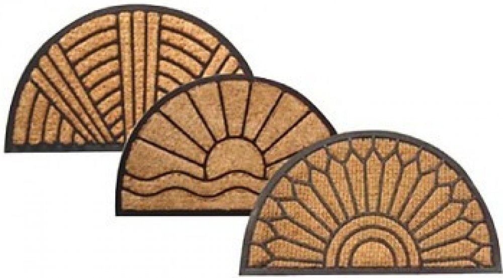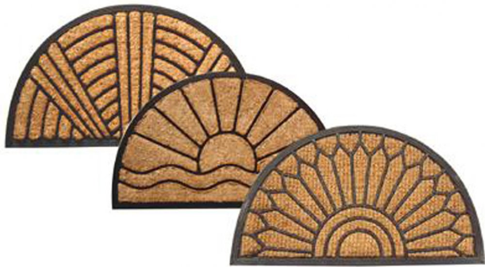 Půlkulatá rohožka z kokosových vláken a gumy. Praktická rohožka před dveře na čištění obuvi. Pletená kokosová vlákna. Díky gumové spodní části je rohožka při čištění obuvi stabilní a po podlaze neklouže. Jednoduché čištění vysáváním nebo vyklepáním. Přírodní hnědá barva. 3 různé designy. Rozměry rohožky 40 x 70cm.