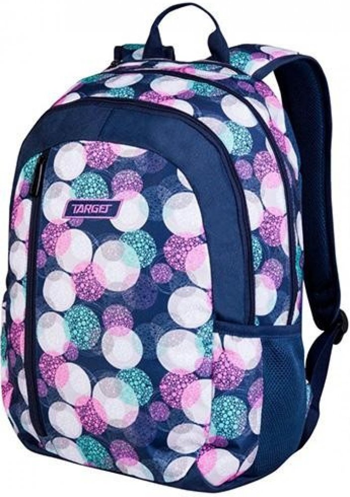Stylový batoh v designu značky Target bude krásným a praktickým doplňkem všech starších školaček či studentek. Tento kvalitně zpracovaný batoh disponuje dvoukomorovým vnitřním prostorem a dvěma předními kapsami na svačinu a jiné drobnější věci. Po obou stranách batohu jsou síťované kapsy opatřené gumičkou. Anatomicky tvarovaná záda batohu jsou příjemně polstrovaná pro pohodlné a dlouhodobé nošení. Funkčně tvarované ramenní popruhy v ideální šíři jsou též polstrované, vzdušné a délkově nastavitelné. V horní části měkké poutko na zavěšení či krátkodobé přenášení. Tento parádní batoh lze využít i pro volnočasové aktivity či na běžné nošení do města!Rozměry batohu: výška 43 cm x šíře 32 cm x hloubka 16 cm.Materiálové složení: 100% polyester.