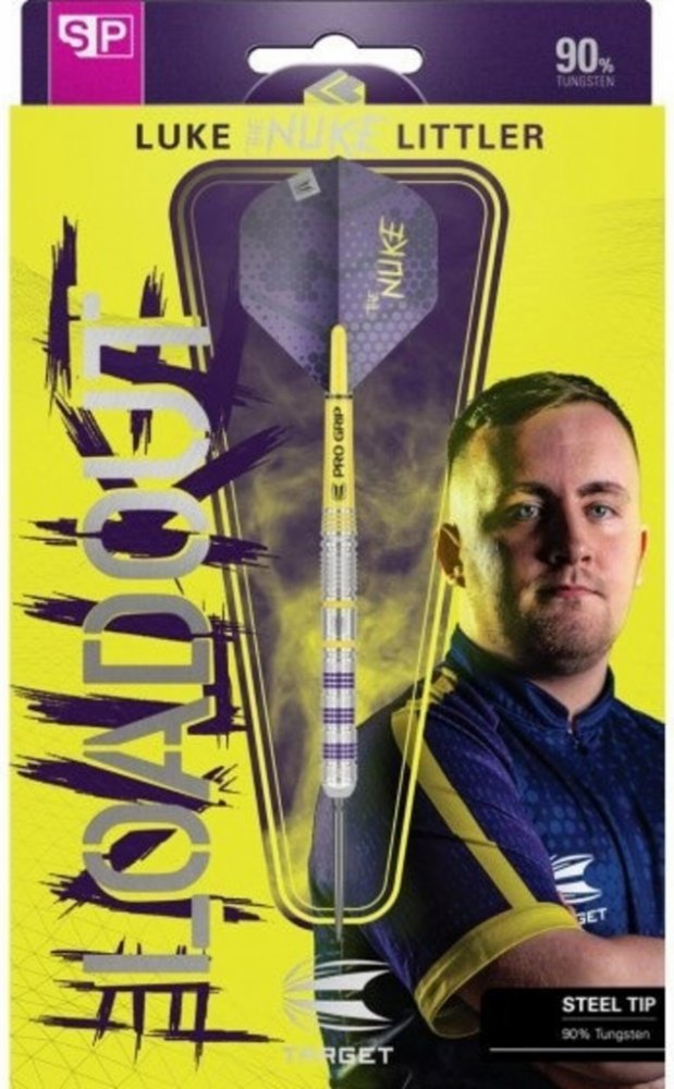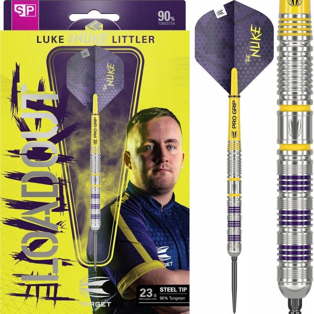 Steelové wolframové šipky Luke Littler Loadout SP (90% tungsten) jsou šipky s drážkovanými barrely, které zdobí fialové a žluté proužky. Barrely jsou doplněny násadkami Pro Grip, letkami Luke Littler a hroty Swiss Point. Součástí balení je i nástroj pro výměnu hrotů Swiss Point.