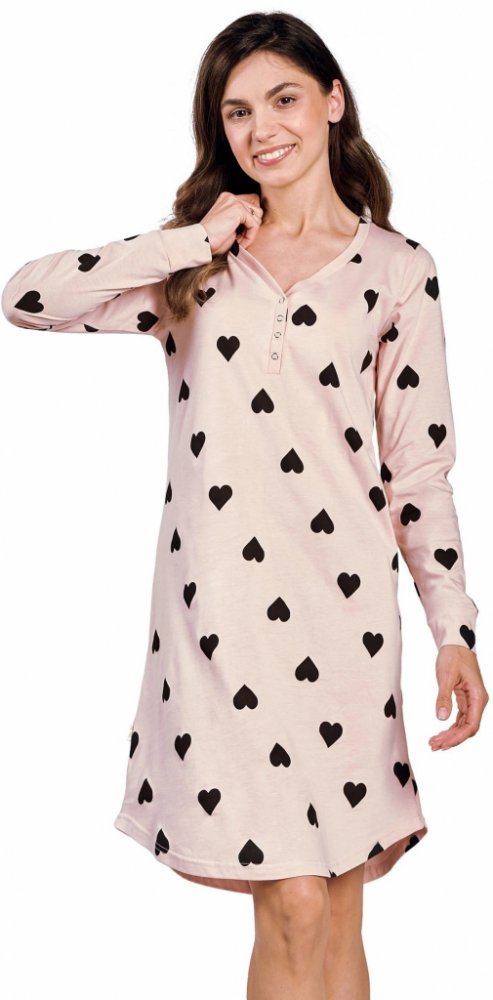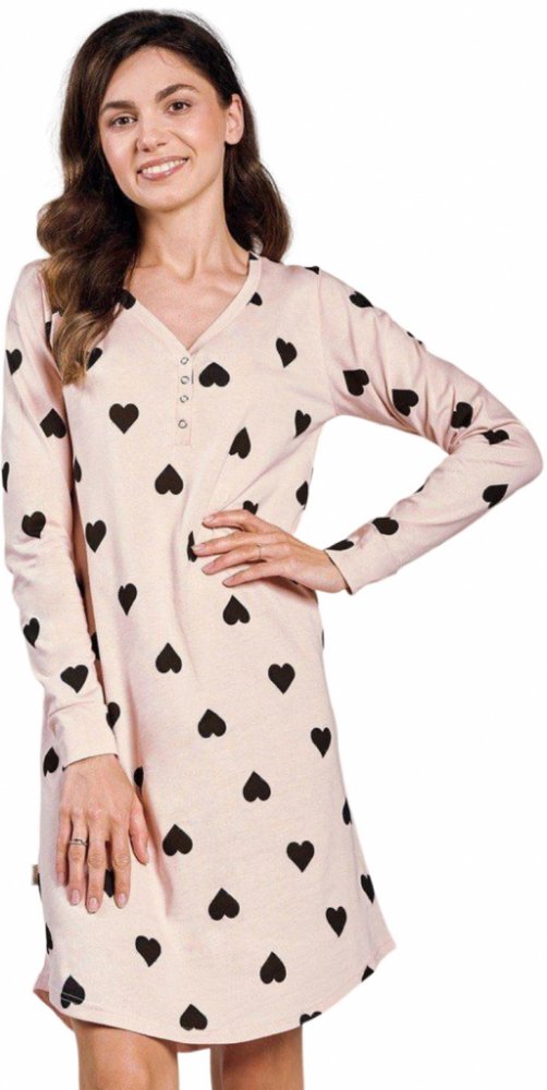 Noční košilka model 199053 Taro S růžový Noční košile, která kombinuje eleganci a pohodlí a je ideální pro každou noc. Má výstřih do V a volný, pohodlný střih pro volnost pohybu. Je vyrobena z měkké tkaniny s potiskem. Model má polopřiléhavý lem, dlouhé rukávy a praktické zapínání na patentky v úrovni prsou. Košile je zabalena v elegantním pouzdře, což z ní činí ideální nápad na dárek. Polský výro...