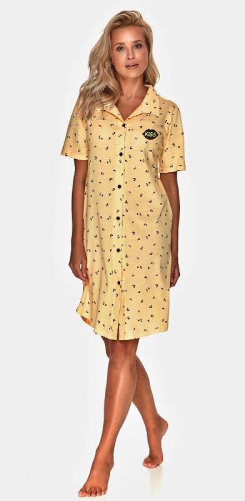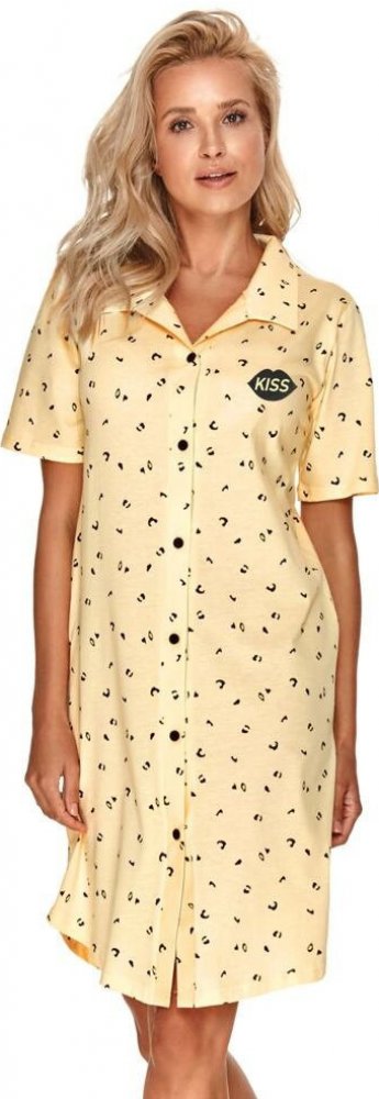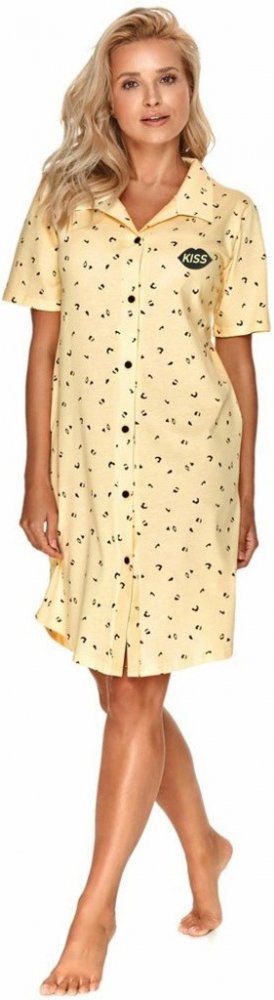 Dámská košilka Adéla žlutá s knoflíky M Dámská noční košile Adéla má oblíbený střih s knoflíky, slušivý límeček a krásnou světle žlutou barvu se vzorem. Košilka je vyrobená z kvalitní bavlněné látky. Má světle žlutou barvu a decentní černý vzor s malým obrázkem pusy na levé straně. Dolní okraj košilky je oble střižený. Košilku můžete rozepnout pomocí knoflíků. Má límeček a krátké rukávy. Košilka j...