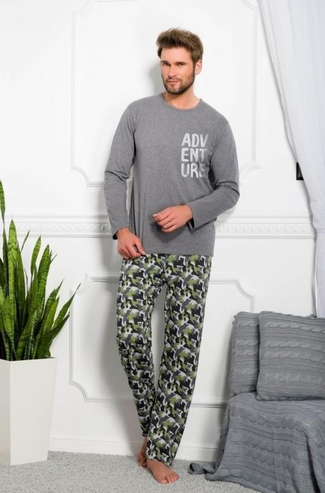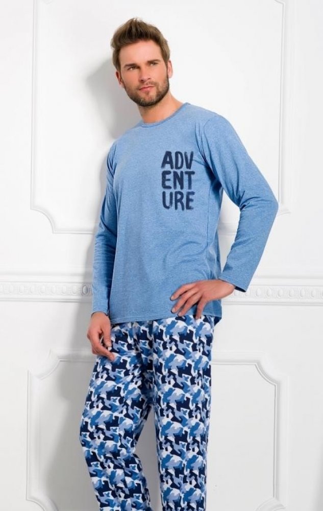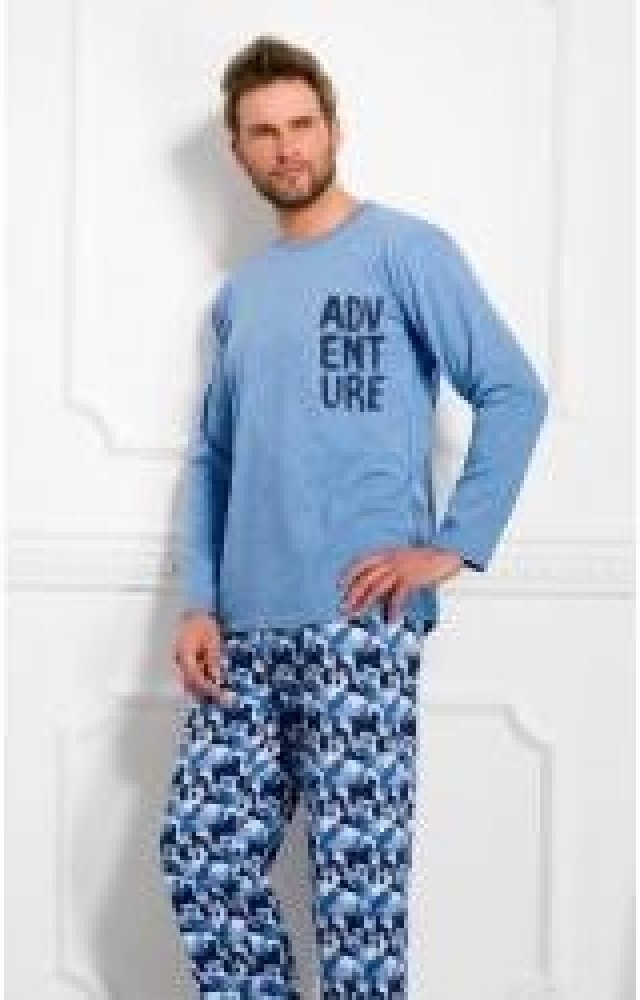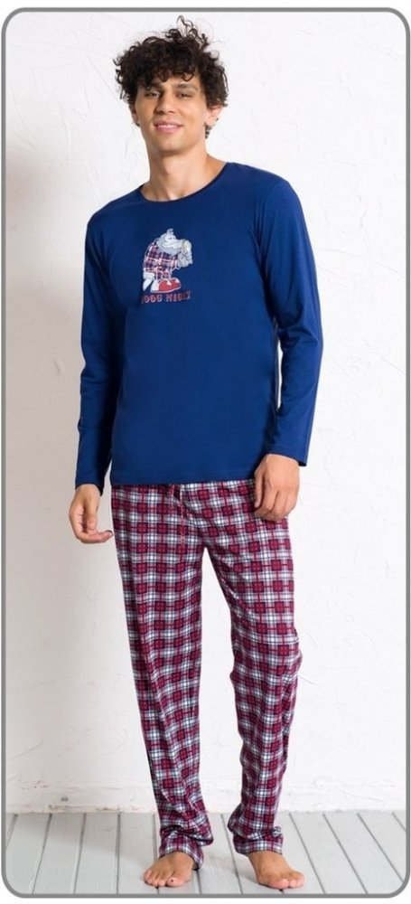 Pohodlné pánské pyžamo, které je vyrobené z měkké bavlny příjemné na dotek. Blůza má dlouhé rukávy a její přední díl je ozdobený nápisem. Kalhoty jsou dlouhé, vzorované.Složení závisí na barvě pyžama: Džínová barva: blůza - 92 % bavlna, 8 % polyester, kalhoty - 100 % bavlna. Šedá barva: 92 % bavlna, 8 % polyester.