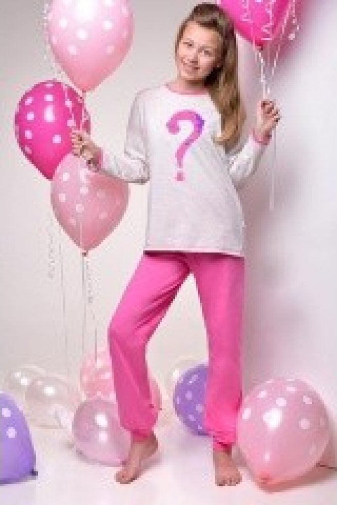 Holčičí paráda! Nebesky měkké bavlněné dívčí pyžamo značky Taro pro dospívající rebelky. Horní díl má dlouhý rukáv a vpředu je ozdoben vtipným motivem. Kalhoty jsou dlouhé, jednobarevné. Pyžámko tvoří světle šedé tričko s obřím růžovým otazníkem + sladce růžové kalhoty.