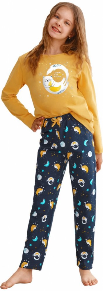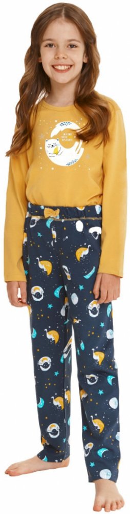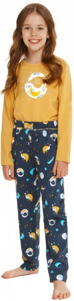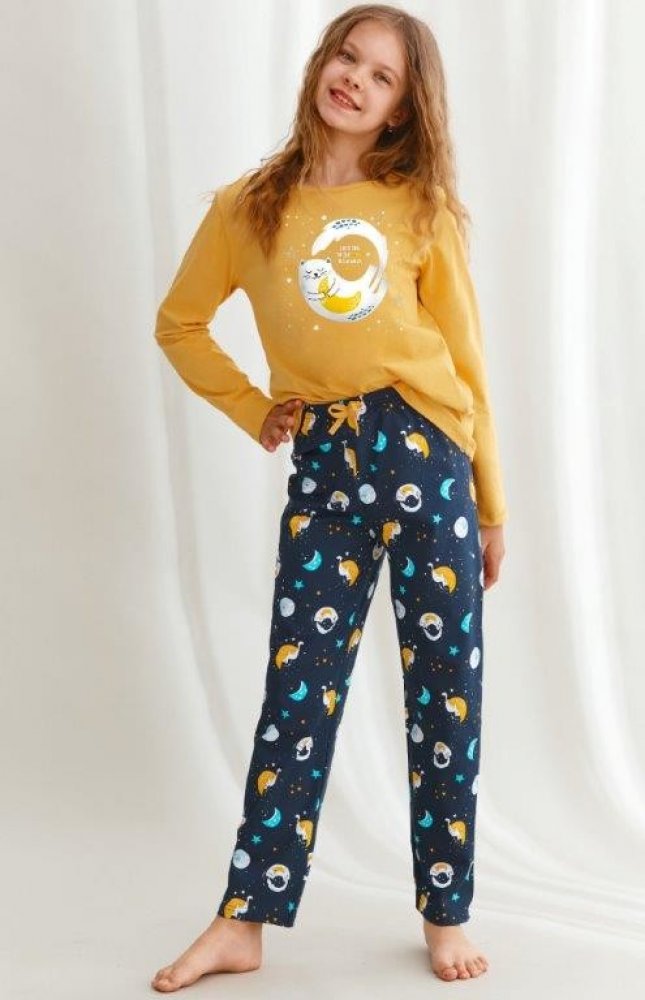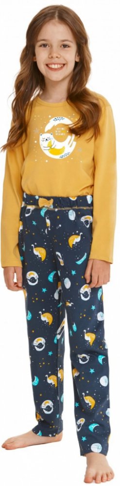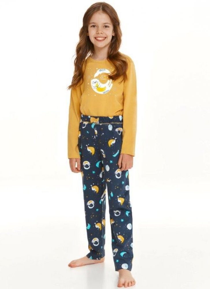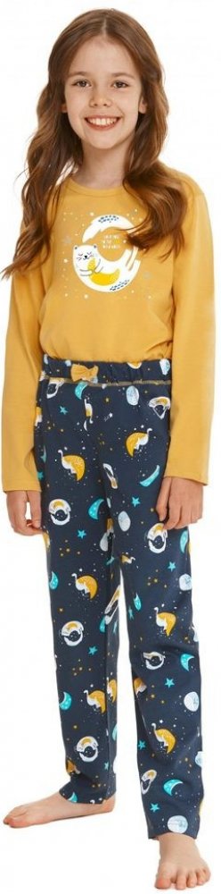 Dlouhé dívčí pyžamo je vyrobené z kvalitní 100% bavlny, která zajistí maximální pohodlí po celou noc. Pyžámko má dlouhé rukávy i nohavice. Je ušité ze 100% kvalitní bavlny, která zajistí dokonalou prodyšnost a maximální pohodlí. Hodí se také pro citlivější pokožku. Vršek dívčího pyžama má kulatý výstřih a žlutou barvu s motivem kočky. Zezadu je tričko lehce prodloužené a šité do oválného tvaru. Spodek je tmavě modrý s motivem koček a noční oblohy po celé ploše. V pase je všitá guma, která se perfektně přizpůsobí postavě.