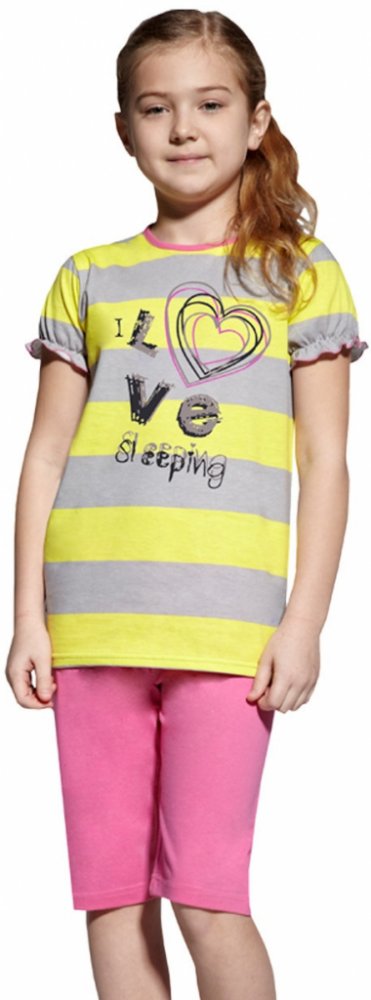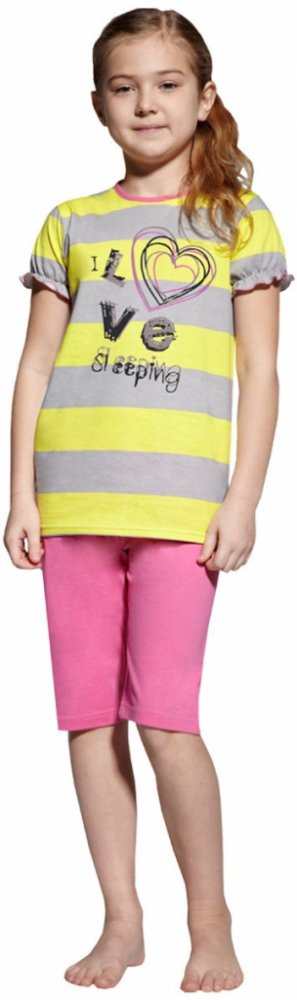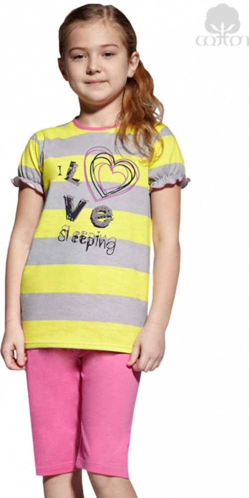 Dětské bavlněné pyžamo s krátkým řaseným rukávem a capri kalhotami. Proužkované tričko je s velkým srdíčkem a nápisem ´I love sleeping´. Capri kalhoty jsou šité bez kapes a mají volnou gumu v pase. Pyžamo je možné používat i jako běžné oblečení na doma.