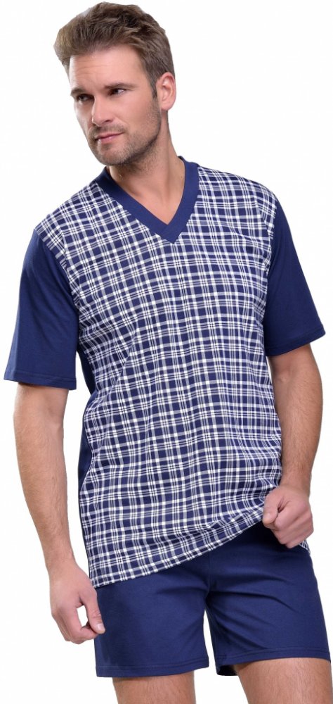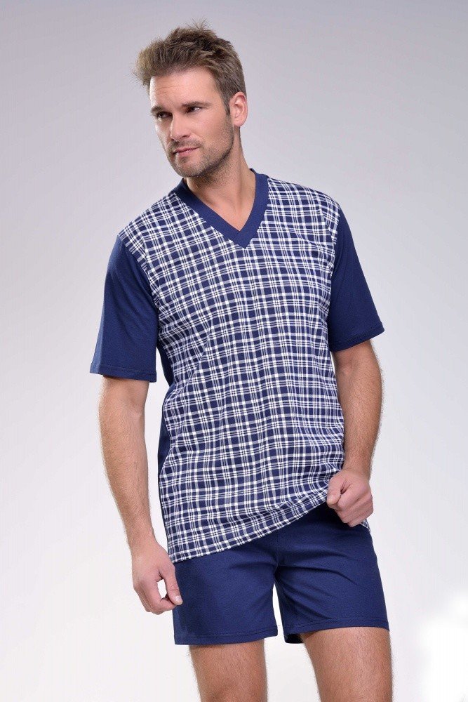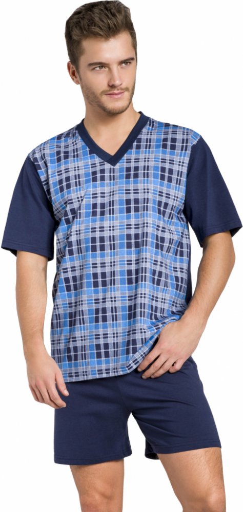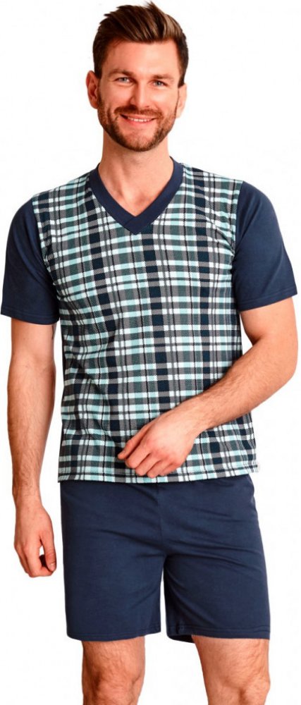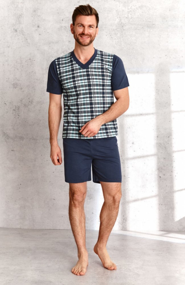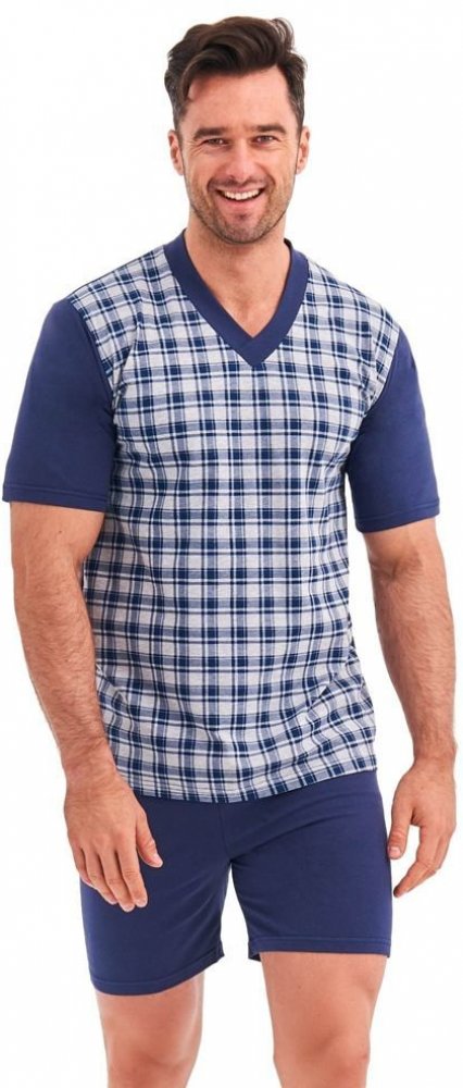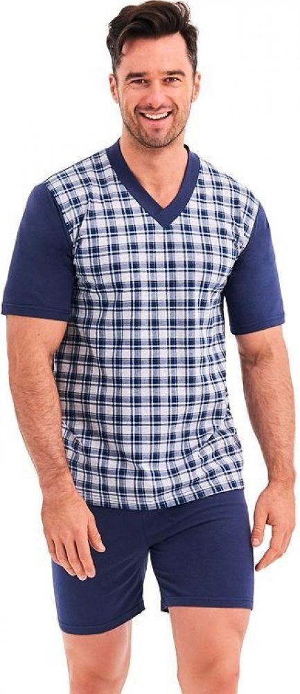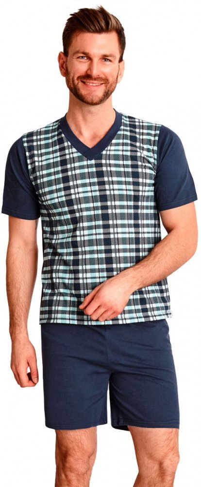 Pánské bavlněné pyžamo Roman s krátkým rukávem a kraťasy. Triko je zdobené pruhovaným vzorem a jednobarevným lemem kolem výstřihu. Kraťasy jsou šity bez kapes a mají volnou gumu v pase.