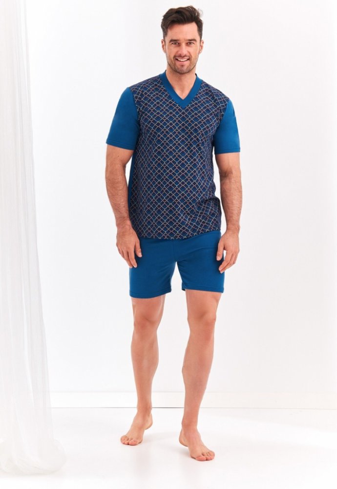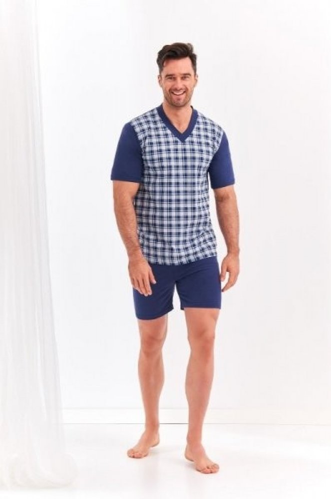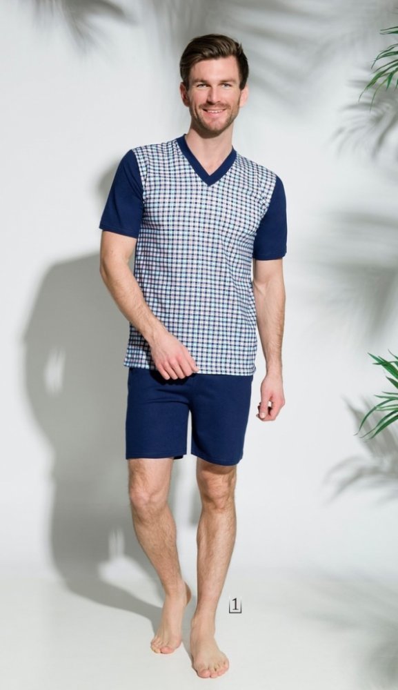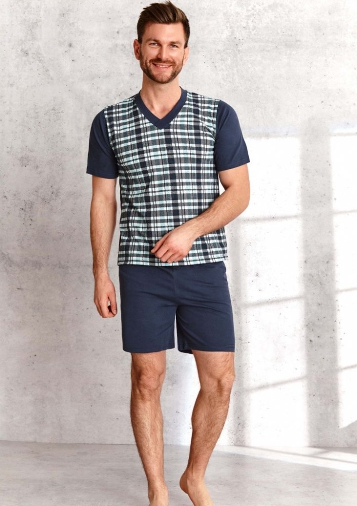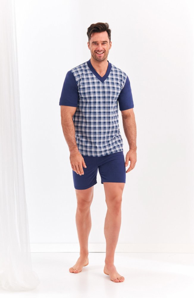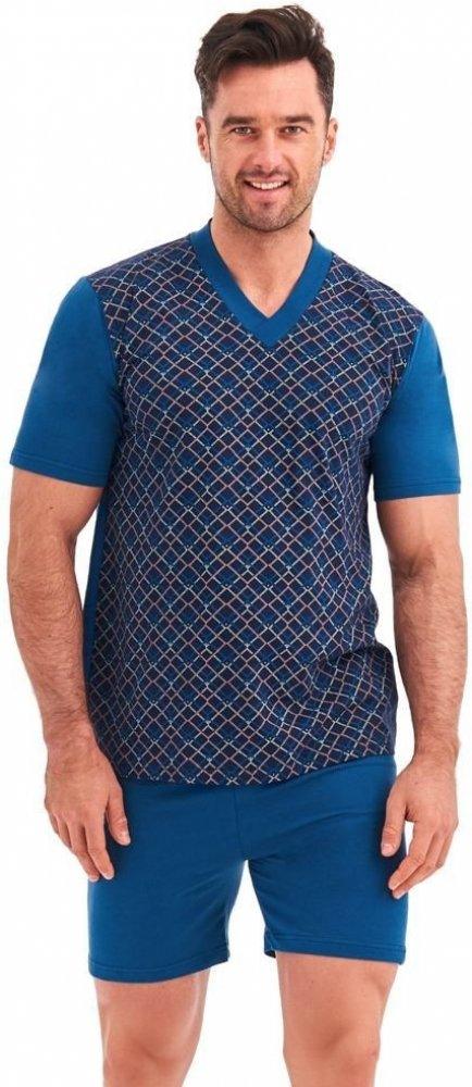 Pánské bavlněné pyžamo Roman s krátkým rukávem a kraťasy. Triko je zdobené pruhovaným vzorem a jednobarevným lemem kolem výstřihu. Kraťasy jsou šity bez kapes a mají volnou gumu v pase.
