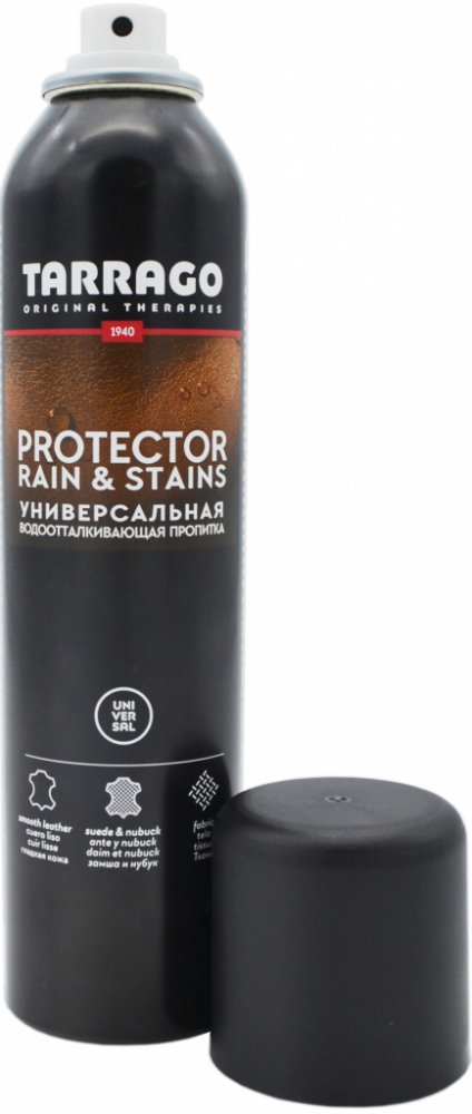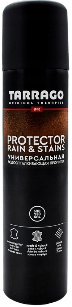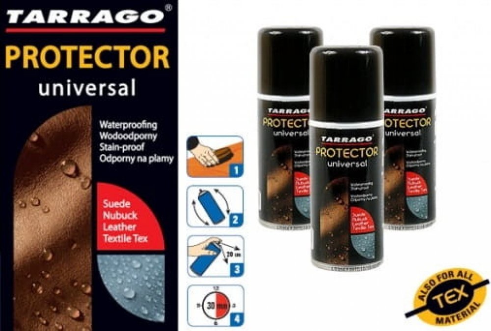 Impregnace Tarrago, model Universal Protector 250, impregnace vhodná pro všechny typy kůží, syntetiky a nubuku, chrání před deštěm, sněhem, mastnotami a olejovými skvrnami. Neovlivňuje originální barvu a přirozené vlastnosti kůže a zachovává prodyšnost. Chrání před skvrnami a zašpiněním, objem 250 ml.