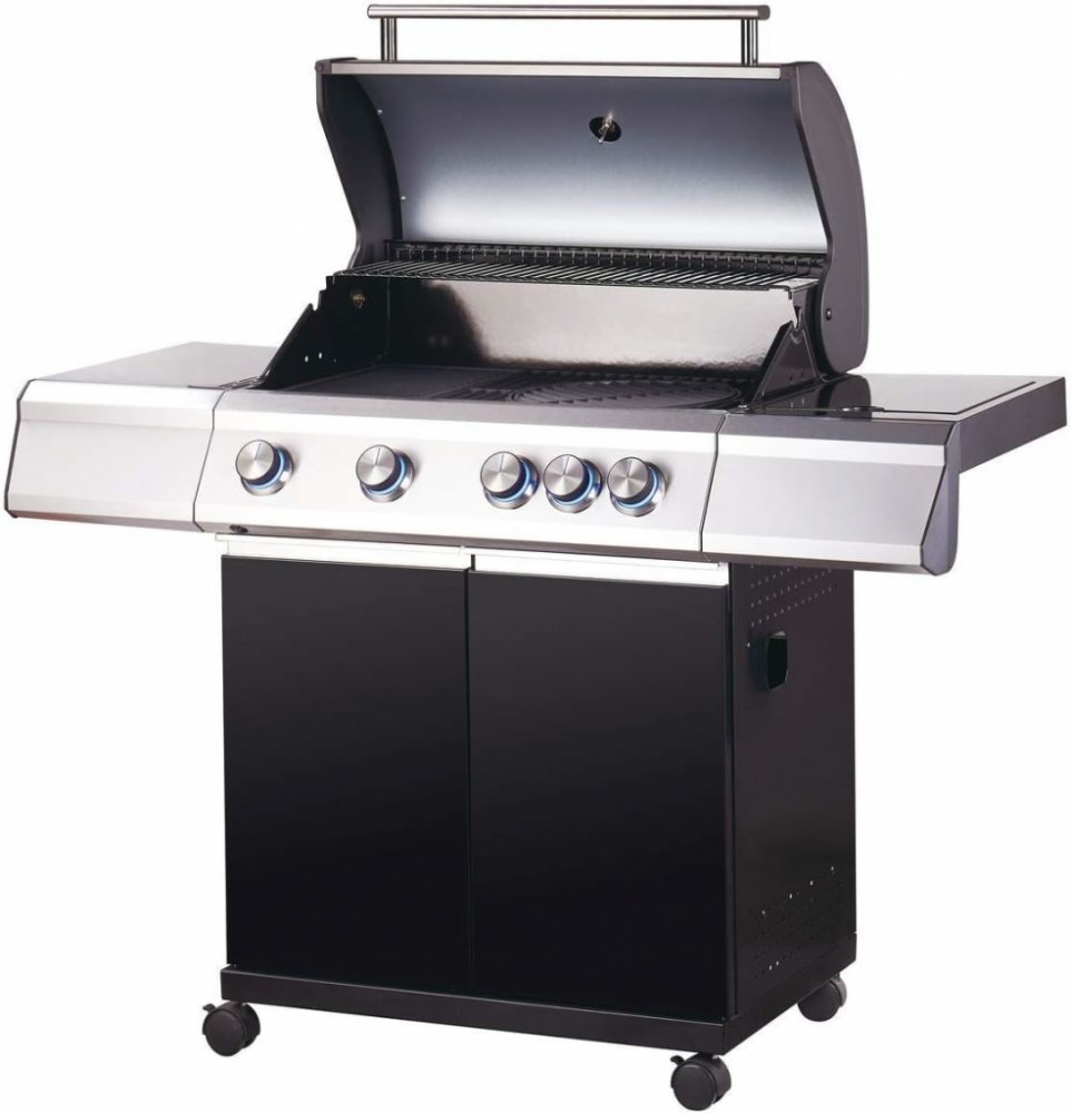- Zahradní plynový gril s kolečky a se 4 hořáky a jednou plotýnkou na hrnec či pánvičku