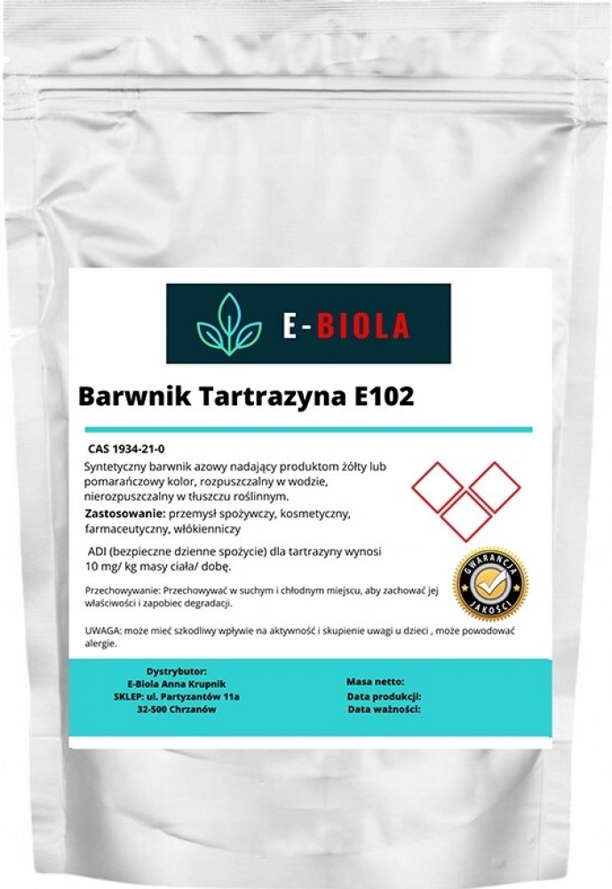 Popis produktu: Tartrazin, označovaný symbolem E102, je syntetické azobarvivo, které dodává výrobkům žlutou nebo oranžovou barvu a je běžně používáno v potravinářském, farmaceutickém a kosmetickém průmyslu. Je také nazýván potravinářskou žlučí 5. Toto barvivo není citlivé na světlo a kyslík. Je také chemicky stabilní při použití v potravinách. Tartrazin si zachovává svou barvu i při kyselých podmínkách (kyselé pH) a vyšší teplotě. Dobře se rozpouští ve vodě, ale ne v rostlinných olejích. Tartrazin v kombinaci s dalšími barvivy – briliantovou modří FCF (E 133) nebo briliantovou zelení BS (E142) umožňuje získávat různé odstíny zelené.