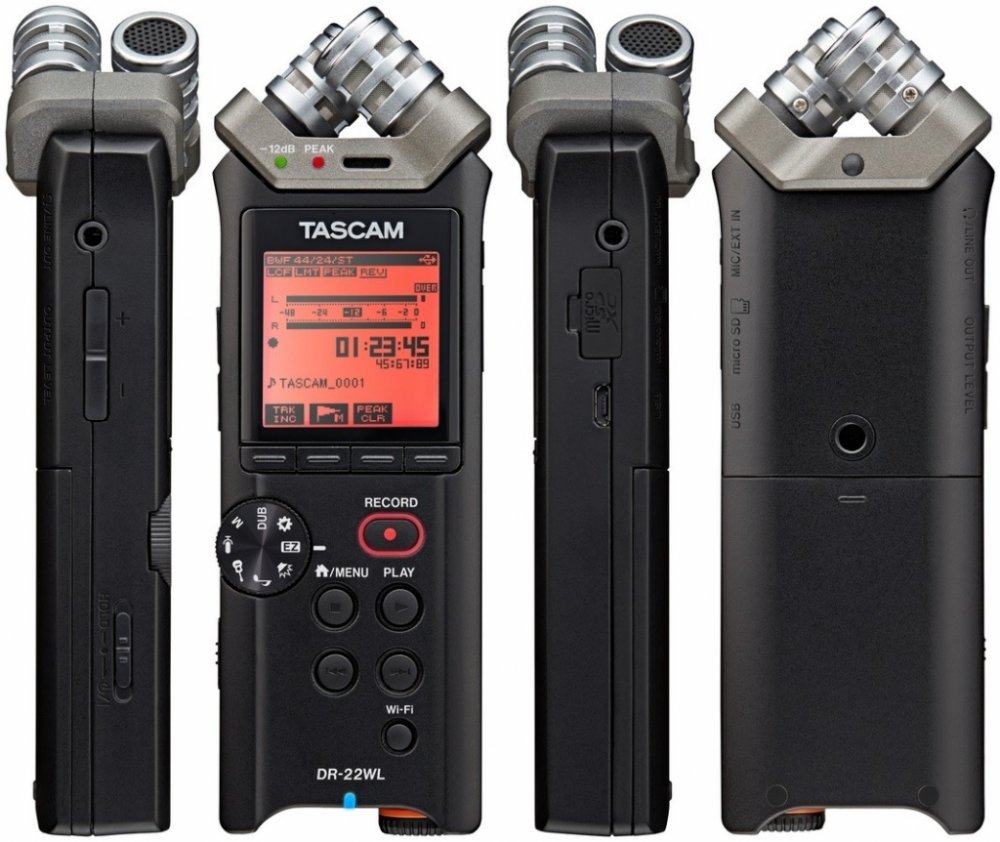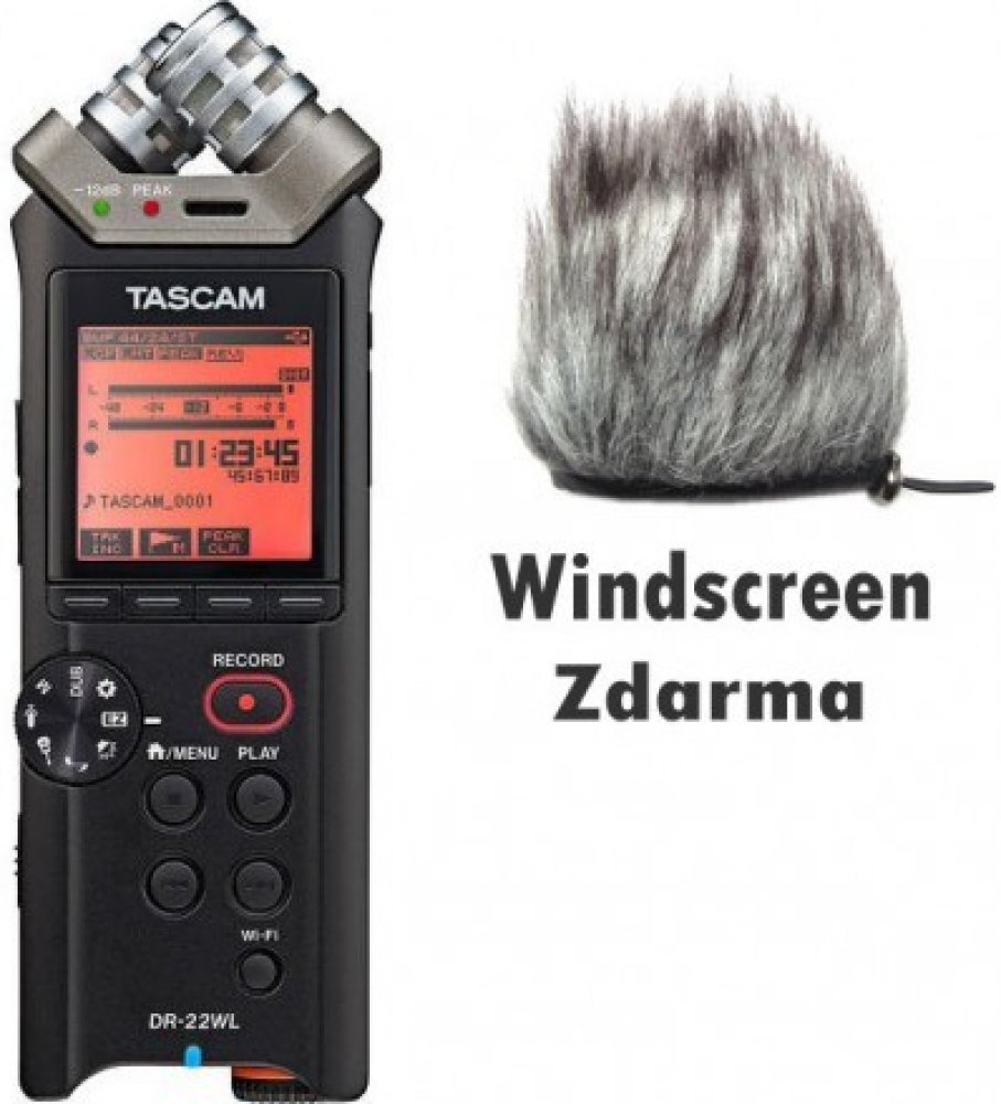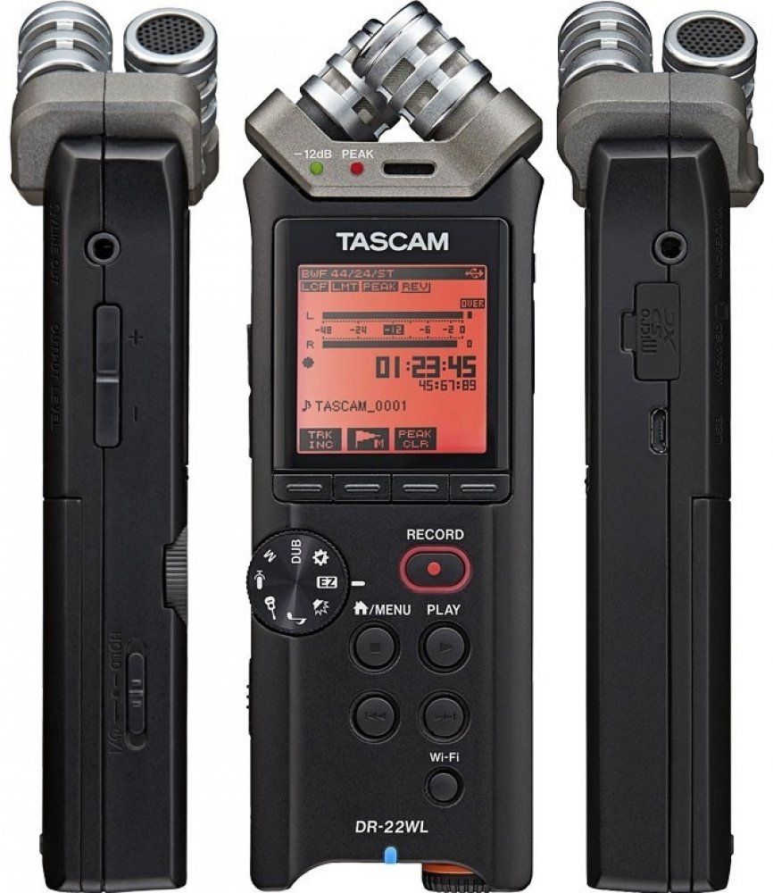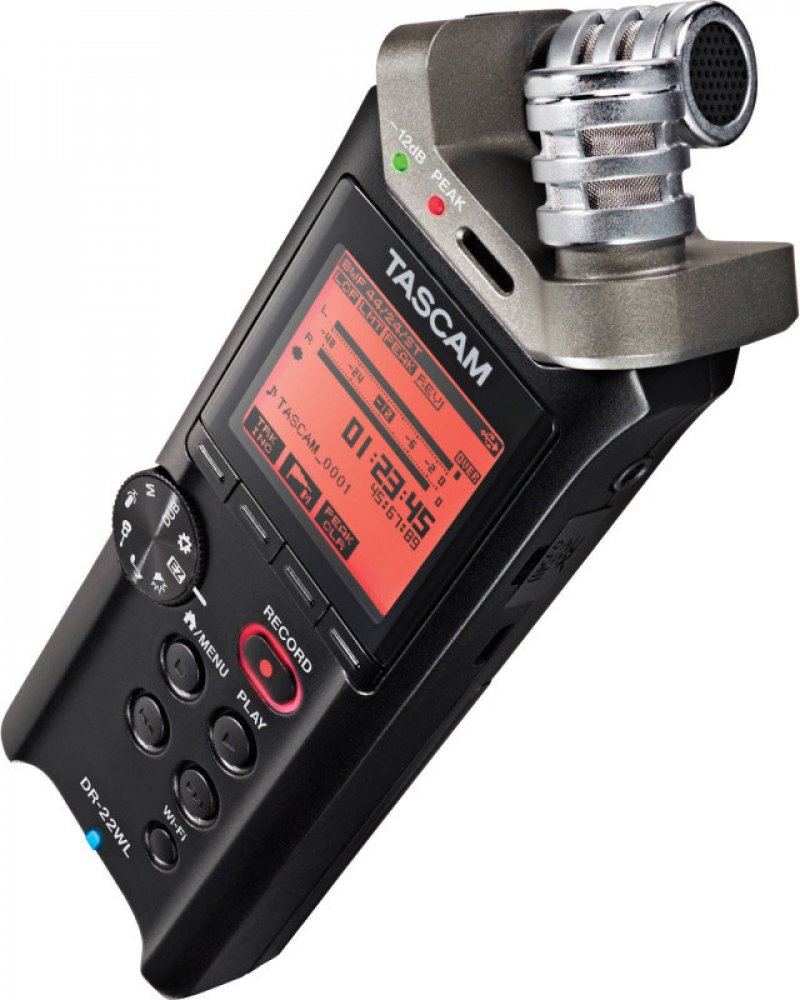Kapesní rekordér DR-22WL je první nahrávací zařízení, které díky WI-FI rozhraní umí přenášet nahrávaný signál do vašeho PC nebo Smartphonu. Dva kondenzátorové mikrofony jsou schopné operovat v X-Y módech. Díky funkci Scene Dial můžete zvolit jednu z osmi nahrávacích situací, které lze dále ještě přesněji nastavit pro maximálně autentické zachycení zvuku. Tascam vyvinul speciální aplikaci, která je kompatibilní se systémy Android iOS. Díky ní můžete nahrávač kompletně ovládat dálkově (až 20 m) z obrazovky svého telefonu. Dále můžete telefon použít jako monitorovací zařízení, když do něj připojíte sluchátka a budete poslouchat streamované nahrávání. Své nahrávky pak můžete okamžitě sdílet či poslat emailem. Tascam DR-22WL je navržen tak, aby si bez zkreslení poradil i ve velmi hlučném prostředí, jako jsou koncerty, kapelní zkoušky, atd. Dokáže se vyrovnat s až 120 dB SPL. Přednastavené nahrávací situace zahrnují: Easy (snadné nahrávání), Loud (hlučná prostředí), Music (akustické koncerty), Instrument (různé typy nástrojů), Interview, Manual (kompletní manuální nastavení), DUB (přehrávání přes již pořízené nahrávky - overdubing), Play (přehrání nahraného). Technické údaje: • Nahrávací zařízení • Wi-Fi pro dálkové ovládání a streaming pomocí telefonu/PC • Speciální aplikace pro Android a iOS • Nahrávání na microSD, micro SDH a microSDXC karty • Vzorkovací frek.: 44.1kHz/48kHz/96kHz (WAV) • 2 kanály – stereo • Napájení: 2AA baterie, USB, adaptér (není součástí) • Max SPL 120 dB • 8 nahrávacích módů • Limiter, gain control • Funkce overdubing • 2 kondenzátorové mikrofony (cardioid) v X-Y mód