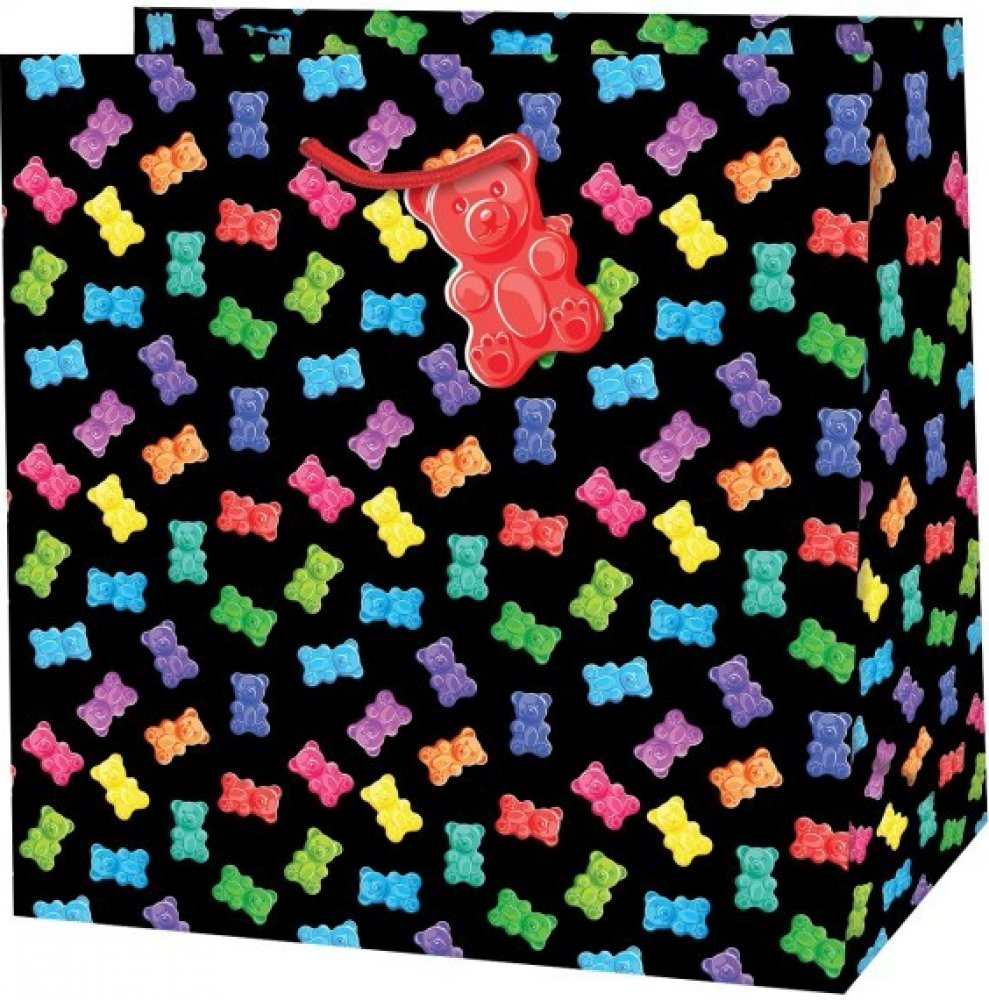 Kvalitní dárková taška je čtvercová s atraktivním designem barevných gumových medvídků.