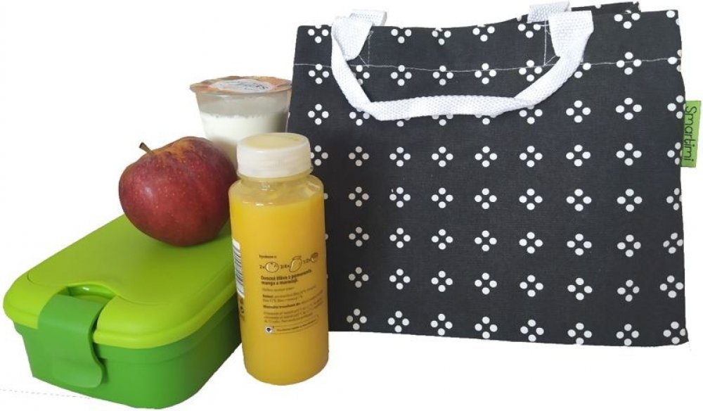 Elegantní taška na jídlo. Vyrobena z kvalitního plátna s trendy potiskem je navržena tak, aby se do ní vešla obědová krabička, svačina i nápoj. Má zavírání na magnetický knoflík a dno je vyztuženo, aby působila vždy elegantně.