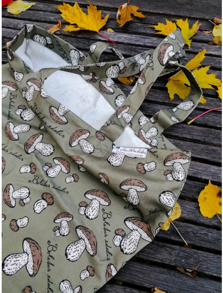 Taška na houby, kterou zdobí desítky menších i větších hřibů na zelenošedém podkladu. Taška je vhodným doplňkem ke košíku v případě neočekávané úrody hub, ale užijete ji také jako módní doplněk při vašich každodenních procházkách. Design látky pochází přímo z dílny Les Houbeles a taška je šitá v České republice.