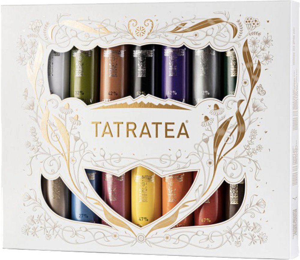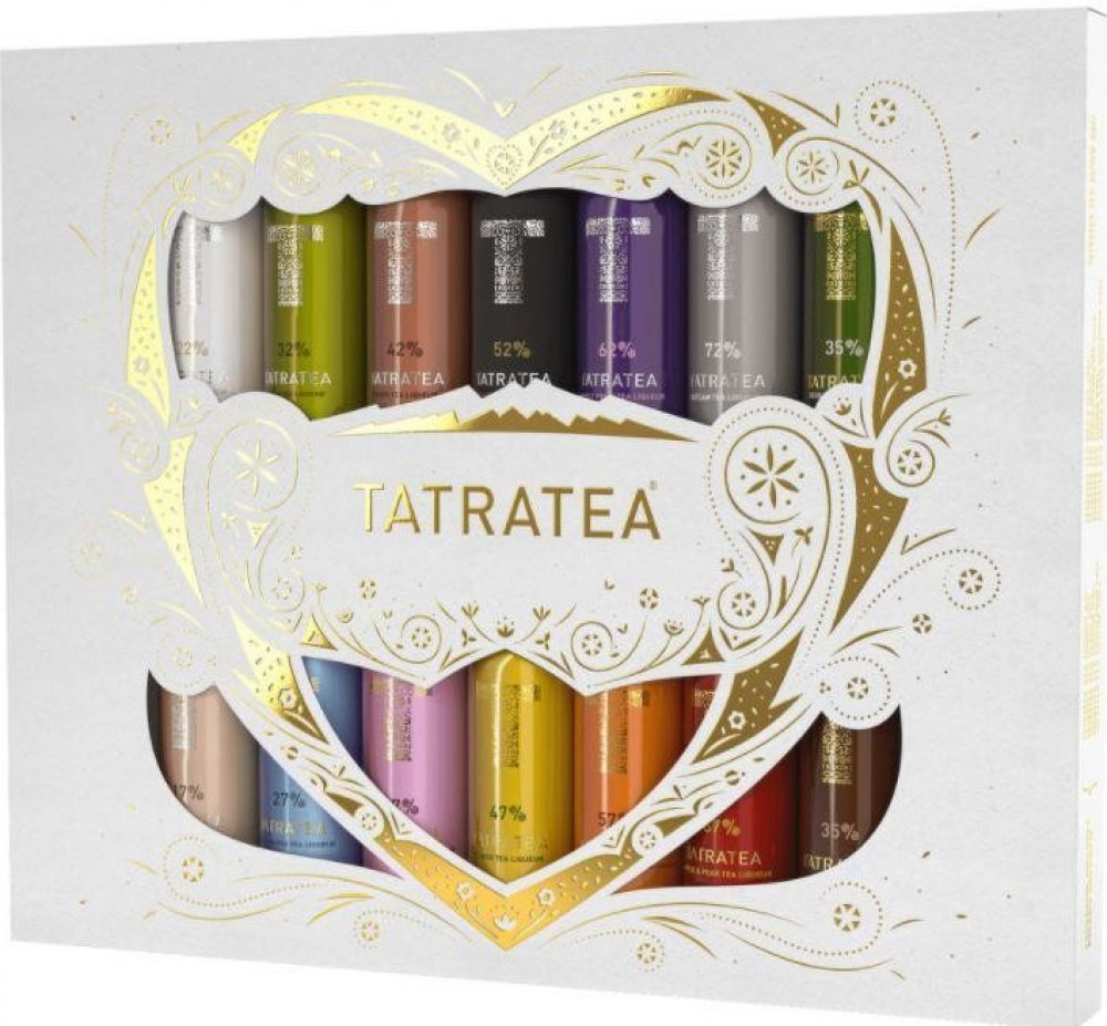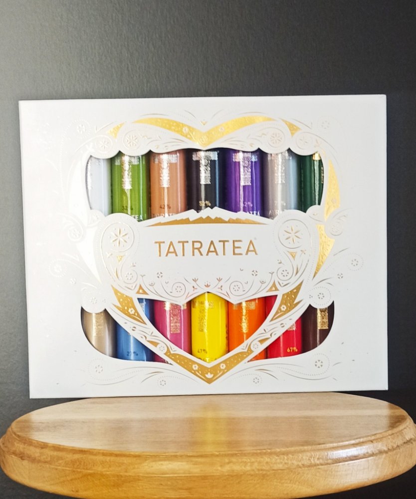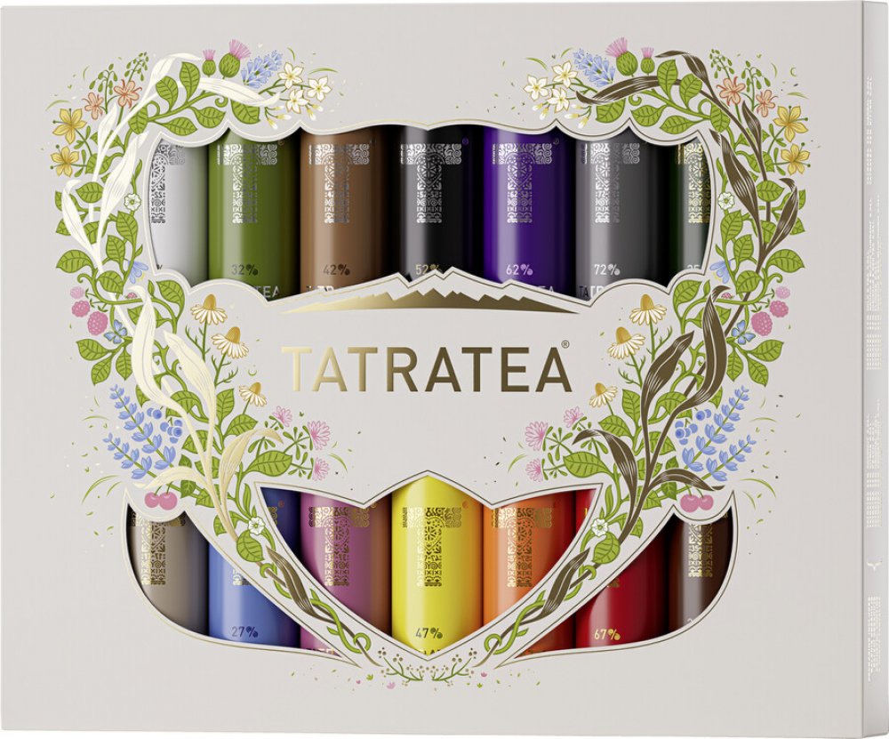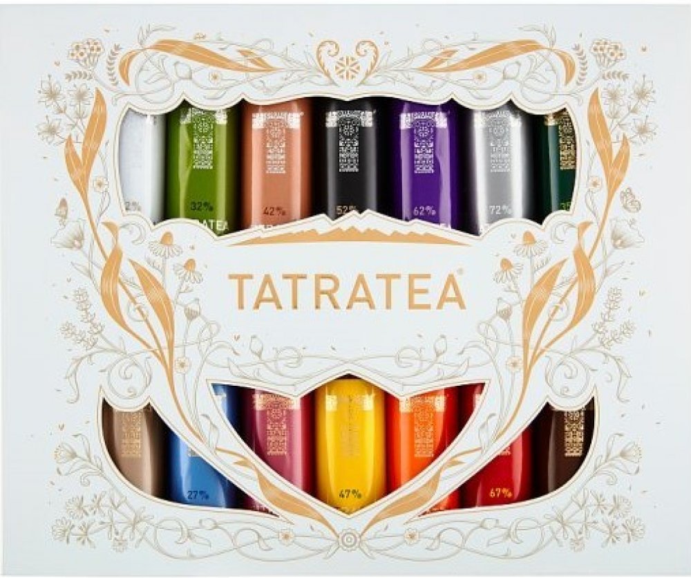 Degustační Maxi Set obsahuje 14 lahviček o objemu 0,04 l: Tatratea 17 % - Čerstvá smetana, vařený vanilkový pudink a aroma koláčů se otevírají do jemné mléčně sladké a čajové suché farmářské zmrzlinové chuti Tatratea 22 % - Kokosový, medový, delikátně sladký Tatratea 27 % - Bohatá po kávě, čokoládě a čaji z červených bobulí s příchutí červených hroznů a zlatého sirupu Tatratea 32 % - Vyvážená chuť aromatických černých čajů připomínajících citrusové bonbóny Tatratea 35 % Herbal Tea Digestif - Sladký první dojem, který se plynule rozvíjí v krátký hořký nádech doprovázený jemnými květinovými tóny růží a jasmínu Tatratea 35 % Herbal Tea Bitter - Dlouhotrvající čajová bylinná chuť na jazyku s čerstvým zeleným pepřem Tatratea 37 % - Sladká pralinová s rozinkami a creme brûlée Tatratea 42 % - Dlouhotrvající broskev docelená medovým vínem, osvěžující stopou žlutých květů a bílého čaje Tatratea 47 % - Cítíme stopy lípy, akácie a pomerančového květu, avšak dominantou je květ bezový se sladkou medovou příchutí Tatratea 52 % - Nasládlá po kandizovaného medu, černého čaje, malin a tajných lesních bylin Tatratea 57 % - Sladkokyselá kombinace svěžích extraktů z rakytníku Tatratea 62 % - Sladká po lesním ovoci jako jsou borůvky, ostružiny a lesní jahody s tradiční chutí černého čaje a bylin Tatratea 67 % - Lahodná hruška s pikantním zázvorem, skořicí a vanilkou obohacená o nasládlý karamel Tatratea 72 % - Výrazná po ovocné bobulovité pálence Destilace Legendární bylinný likér ze srdce Slovenska v sobě spojuje prvotřídní černý čaj z Indie, pramenitou horskou vodu, dubové hobliny a přísně tajnou směs tatranských bylinek a koření. Příběh Bylinný likér Tatranský čaj známý také jako Tatratea, už po staletí vlévá sílu do žil nejen horalům na Slovensku. Do velkovýroby jako takové se pustila firma KARLOFF s.r.o. až v roce 2003 pod vedením Jána Semaňáka. Pod značkou Tatratea vyrobil legendární „dvaapadesátku“ Original a obnovil tak tradici tohoto výjimečného moku. Doporučení Obecně se konzumuje buď horký, nebo chlazený s kostkou ledu. Svou „pravou tvář" vám však ukáže, pokud zalijete 5 cl Tatranského čaje 15 cl vařící vody nebo horkým čajem. Taktéž je vděčným základem míchaných long drinků, ať už použijete colu, tonic, sprite nebo i jednoduše jen s řezem citrónu. Dobré pití si zaslouží vhodnou sklenici. Bezolovnatý ručně zpracovaný křišťál od Moseru uspokojí i ty nejnáročnější požadavky. Prohlédněte si naši nabídku sklenic na likéry.
